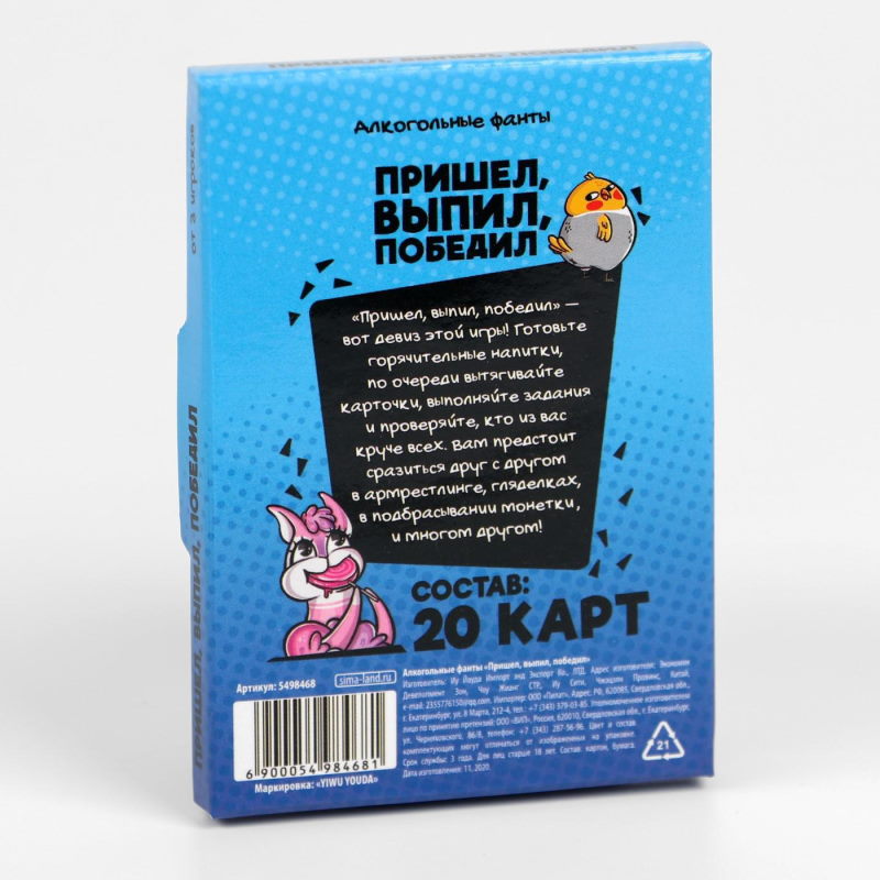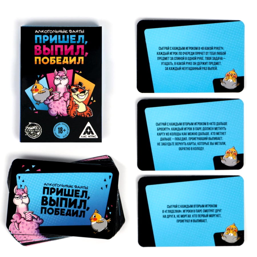 «Пришёл, выпил, победил» — вот девиз этой игры! Готовьте горячительные напитки, по очереди вытягивайте карточки, выполняйте задания и проверяйте, кто из вас круче всех. Все задания написаны на самих карточках. Вам предстоит сразиться друг с другом в армрестлинге, гляделках, в подбрасывании монетки и многом другом!