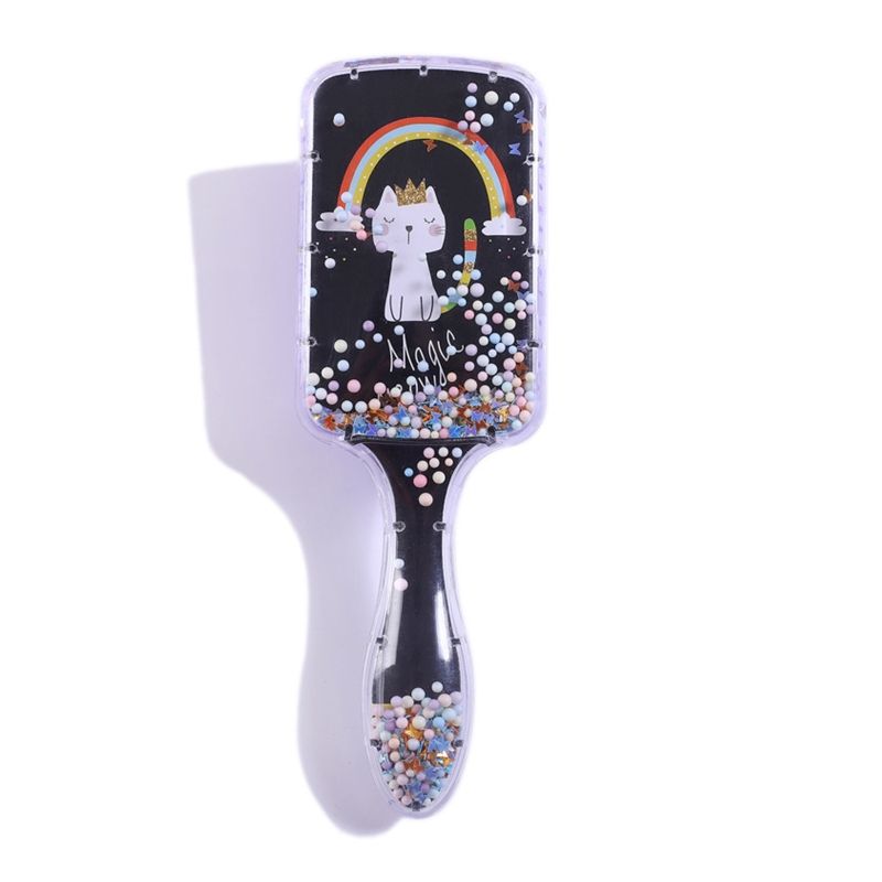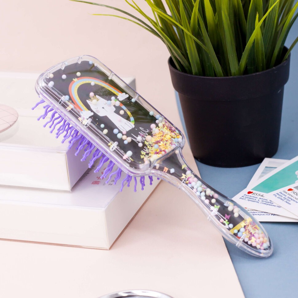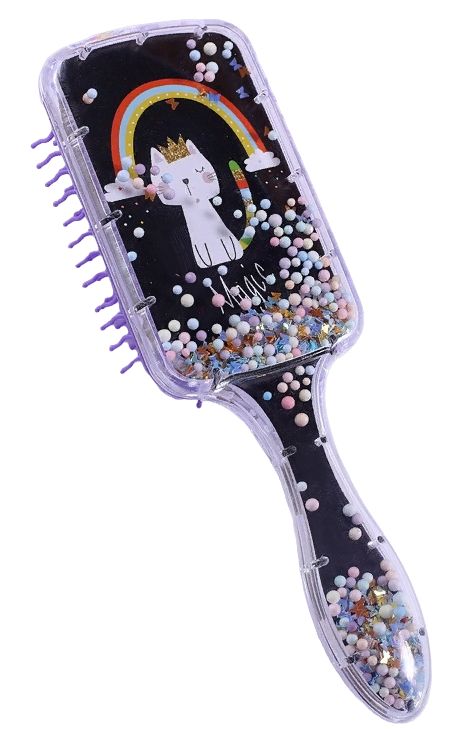 - Весёлые элементы: Забавные встряхиваемые пайетки и пенопластовые шарики внутри корпуса придают расчёске дополнительный шарм и поднимают настроение. С такой расчёской каждое расчесывание станет не просто рутиной, а настоящим удовольствием!