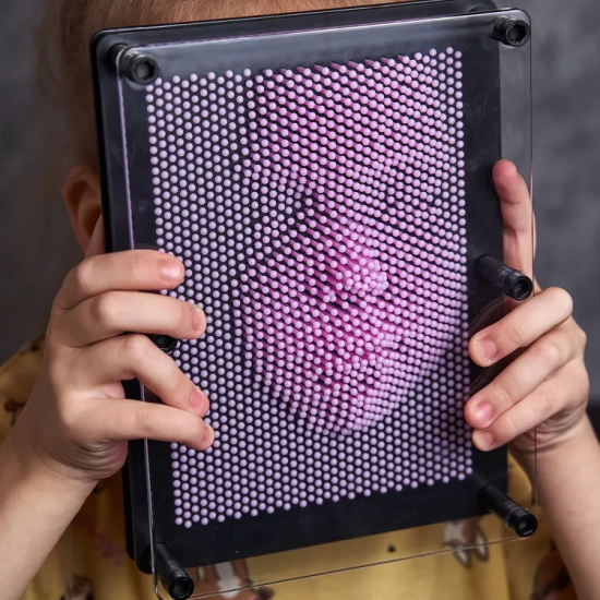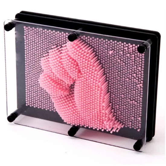 С помощью этого набора для создания пин-арт фигур вы легко можете создавать скульптуры в формате 3D в считанные секунды. Принцип работы довольно прост - в пластиковой панели располагаются множество маленьких пластиковых стержней. Вам достаточно приложить что-нибудь (руку, лицо, телефон) в панели и перевернуть ее - тут же на обратной стороне отразится ваша 3d-скульптура. После этого ее аккуратно можно поставить, например, на стол, в качестве элемента декора.