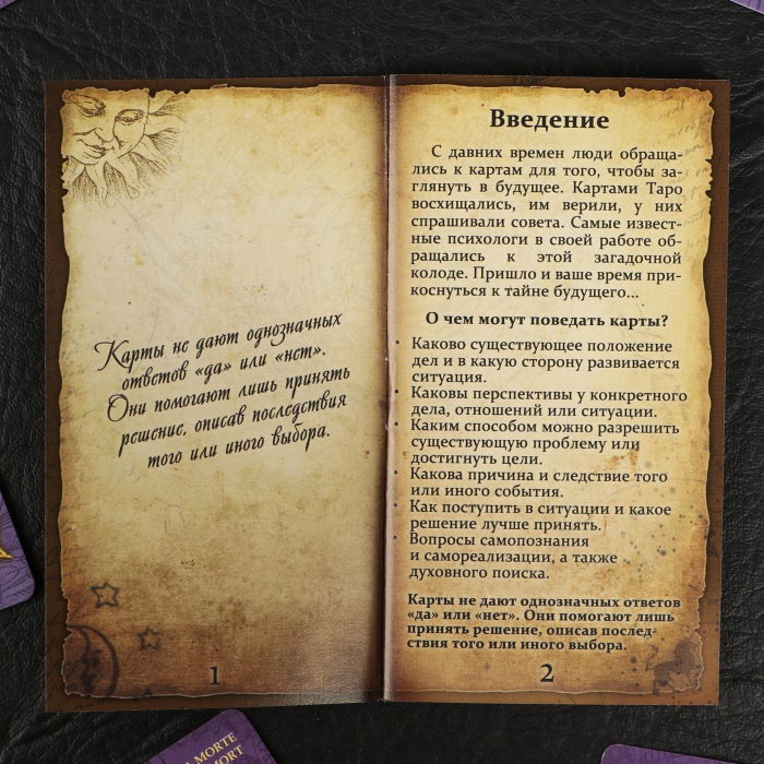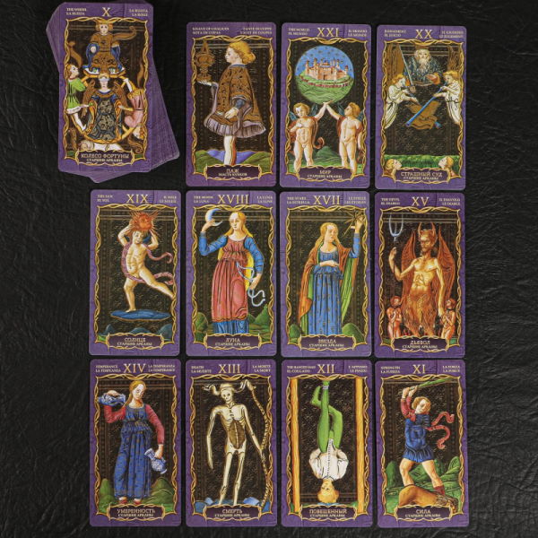 Карты Таро используются для гадания. Изображения на картах таро имеют сложное истолкование с точки зрения астрологии, оккультизма и алхимии, поэтому традиционно таро связывается с тайным знанием. Все карты колоды делятся на две группы: старшие арканы и младшие. Карты выполнены из прочного материала с четкой пропечаткой рисунка. С помощью гадания можно узнать влияние прошлого на текущую ситуацию или интересующий вопрос, разобраться в своих проблемах или взаимоотношениях со своими партнерами или недоброжелателями, понять как лучше поступить, чтобы вопрос разрешился благоприятно.