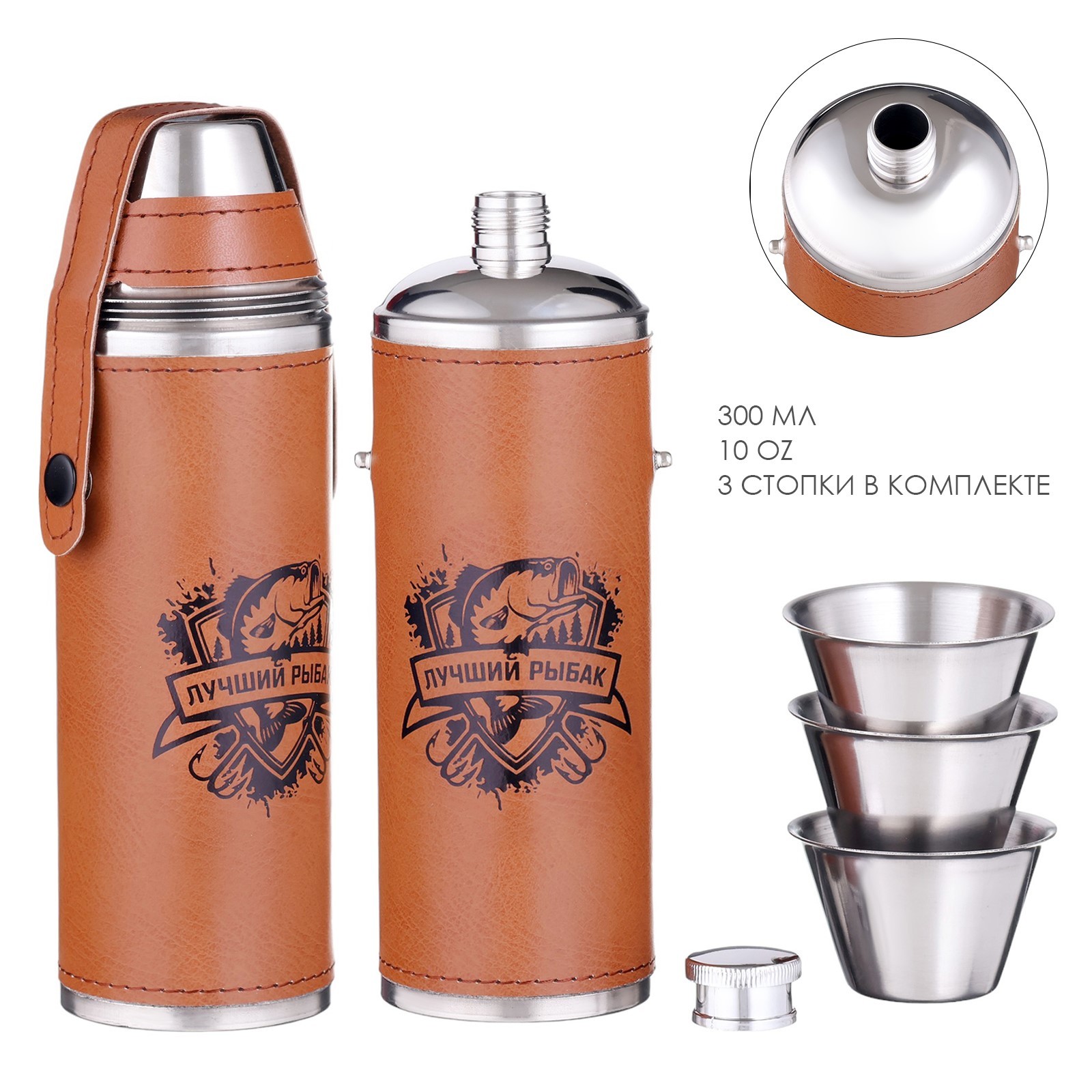 Фляжка для алкоголя 300 мл, «Лучший рыбак», нержавеющая сталь, 3 стопки по 30 мл