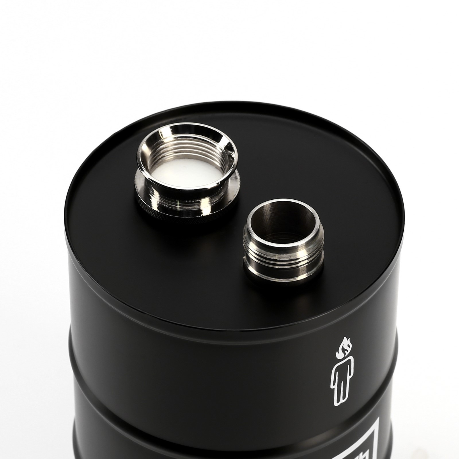 - Дизайн: Оригинальная форма в виде топливной бочки черного цвета с белыми надписями придаёт фляжке стильный и необычный вид.