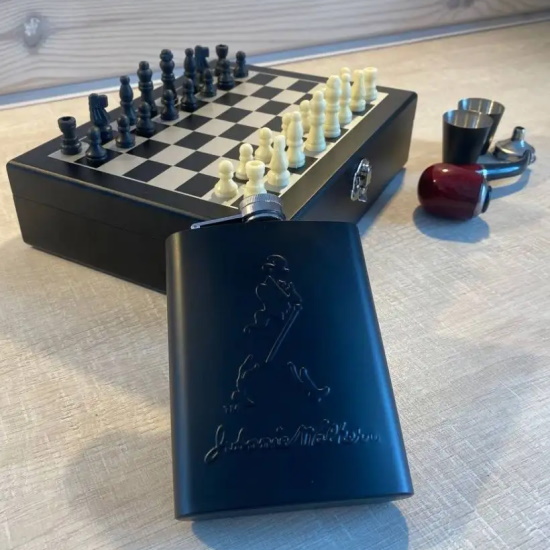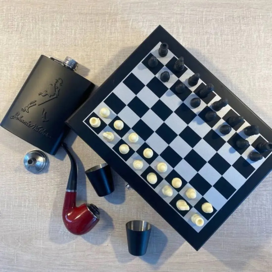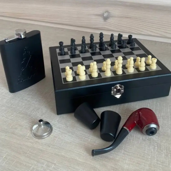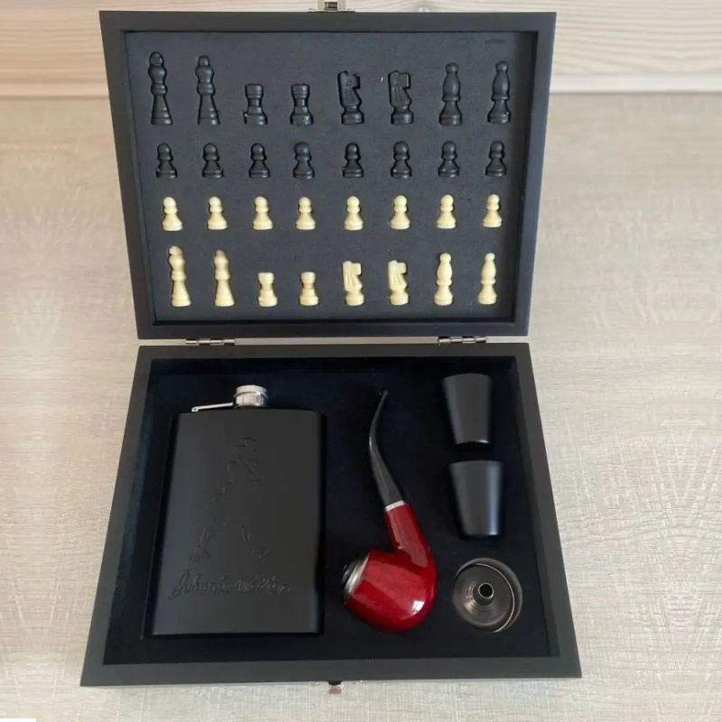 Подарочный набор для мужчины из фляжки 250 мл, 2 рюмками по 30 мл, воронкой и трубкой для табака. Фляжка надежно закручивается на резьбе и напитки не прольются. Так же фляжка будет полезна для пикника, для рыбалки и охоты. Этот набор сочетает в себе стильный дизайн, высокое качество и функциональность, делая его прекрасным выбором для любого праздника или особого случая. а изготовлена из нержавеющей стали, что обеспечивает долговечность и сохранность аромата напитка. Воронка помогает заполнять бутылку через горлышко. Трубка понравится любителям табака. Всё это помещается в деревянную шкатулку с шахматной доской внутри которой так же находятся сами шахматы прекрасный и стильный подарок для мужчины.