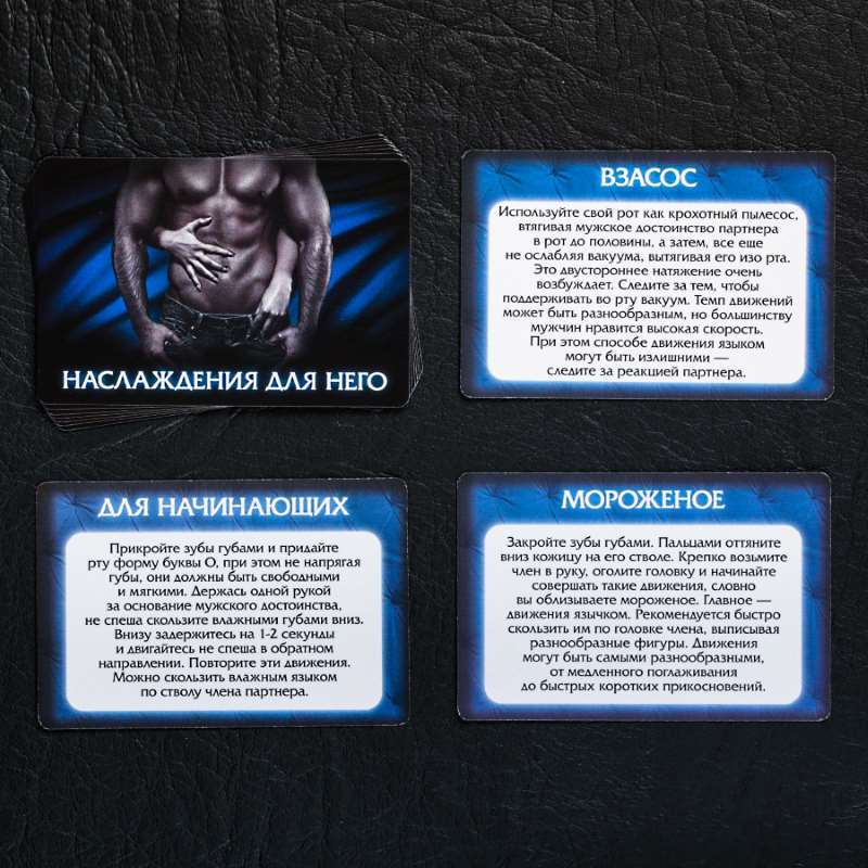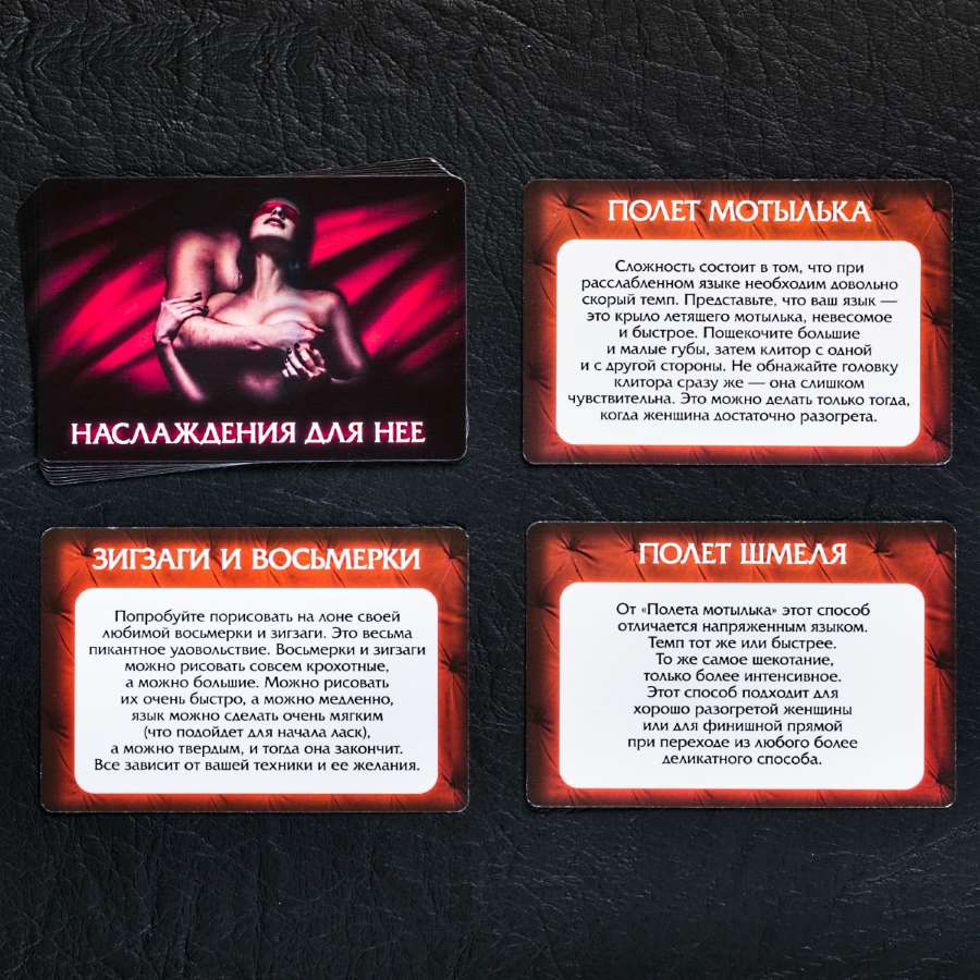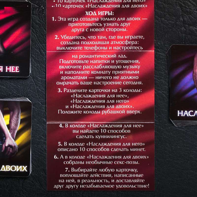 Воплощайте самые смелые фантазии. Внутри вы найдёте карточки трёх видов: «Наслаждение для неё», «Наслаждение для него» и «Наслаждение для двоих».