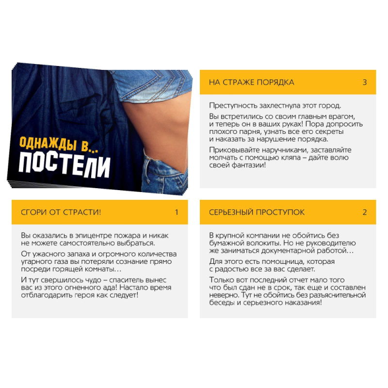 Внимательно изучите карточки и выберите ролевую игру, которую хотите попробовать сегодня. Осталось только подготовить соответствующий реквизит и костюмы. Пришла пора дарить друг другу наслаждение!