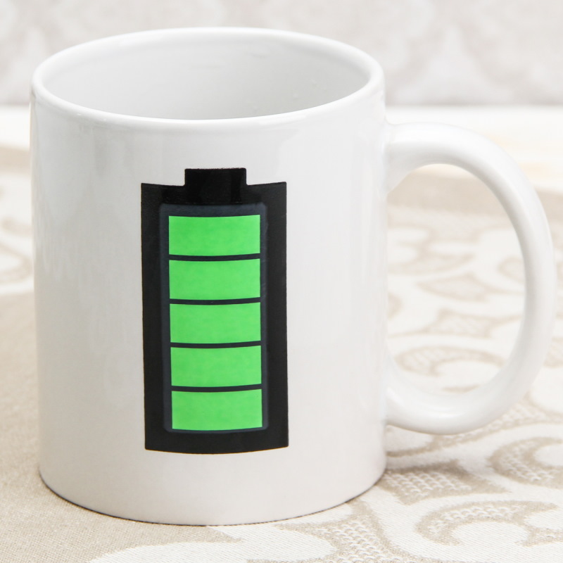 Кружка-хамелеон поднимет настроение даже хроническому соне. При нагревании кружки, на батарейке увеличивается заряд – так, наливая утренний ароматный кофе или вкусный чай в кружку, Вы увидите, как этот бодрящий напиток зарядит Вас энергией и позитивным настроением.