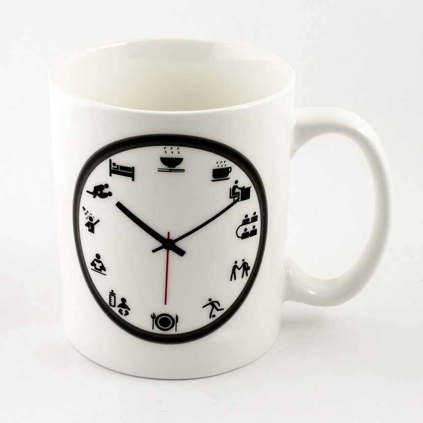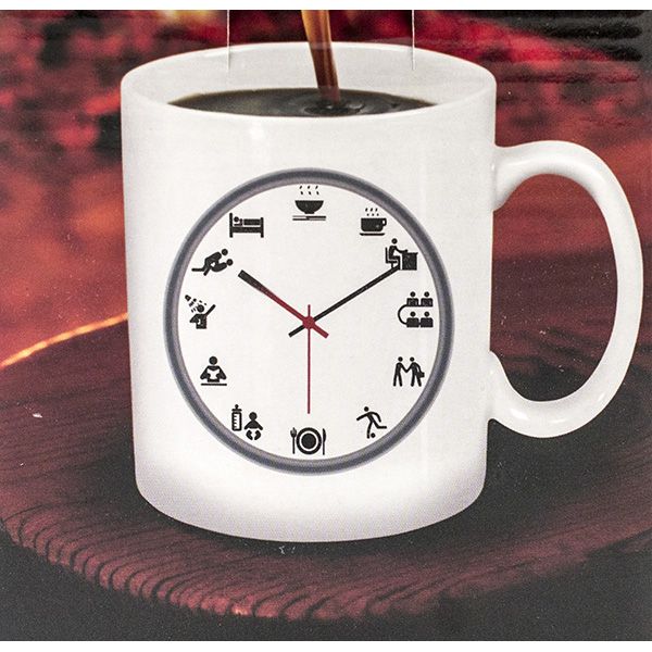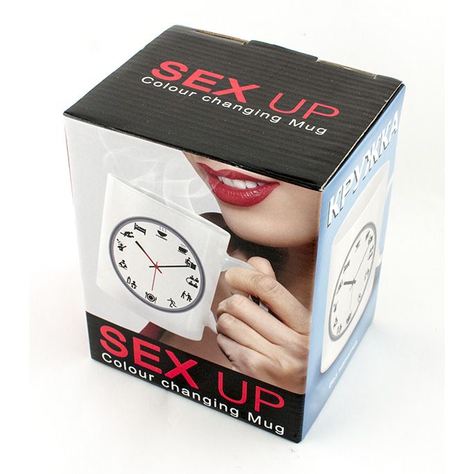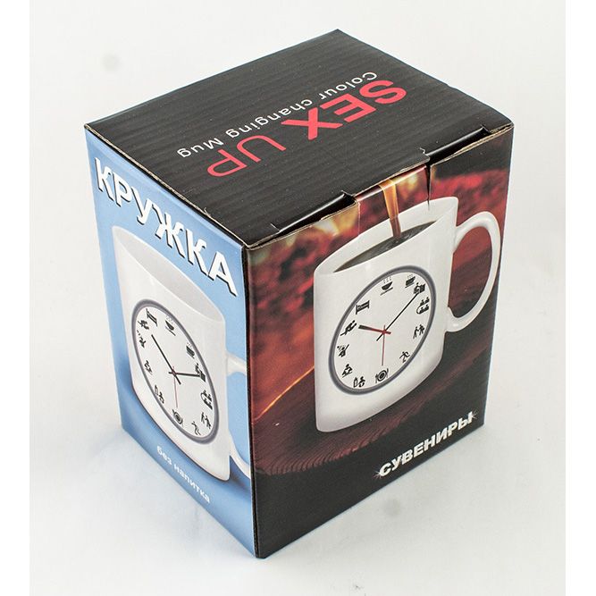 Благодаря специальной термочувствительной краске на основе жидких кристаллов кружка имеет двойное, меняющееся при использовании, изображение. Чёрным цветом нарисован шуточный циферблат с расписанием дня, а при наливании горячего напитка в кружку стрелочка и картинка, символизирующие занятия любовью, становятся красными. Подарок говорит: Среди суеты, забот и дел всегда можно найти время для любви!