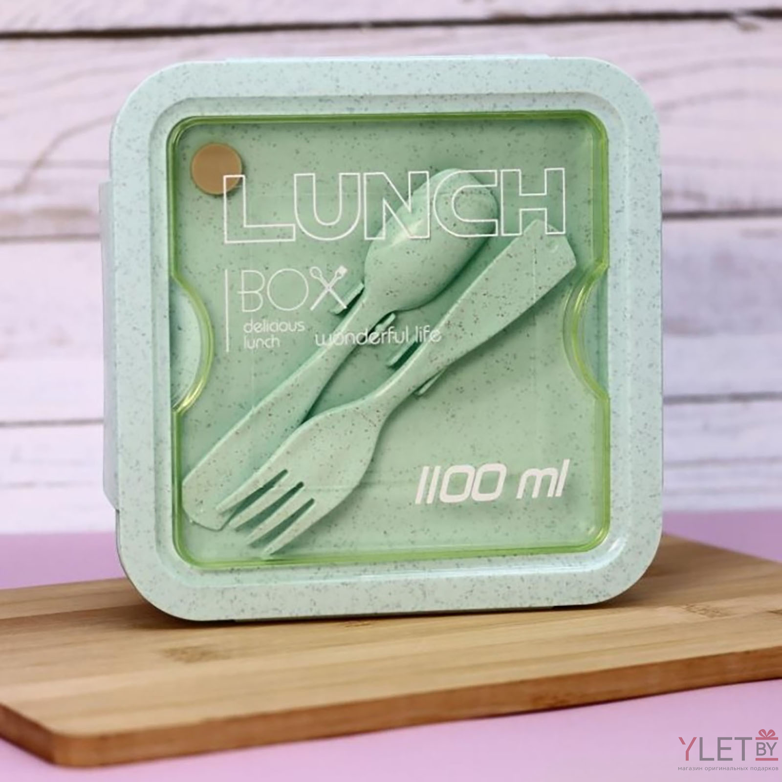 Ланч-бокс изготовлен из высококачественного пищевого пластика и имеет размеры 17x7x7 см с весом 327 г и объемом 1100 мл.