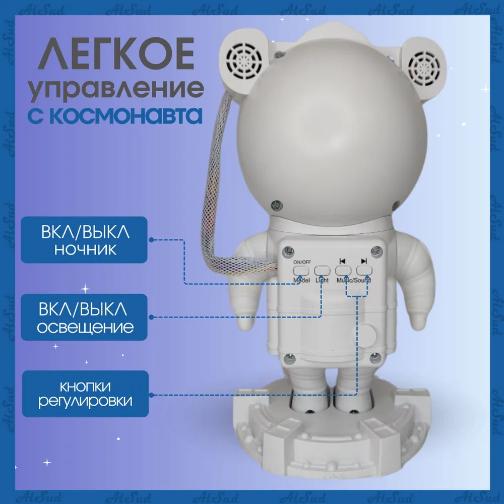 Ночник-проектор в виде космонавта, который создает удивительную атмосферу с звездным небом в вашей комнате. С мощностью 5W и длиной волны лазера 532 нм, он идеально подходит для создания уютной атмосферы. Поддерживает Bluetooth для удобного подключения к вашему устройству. Управление осуществляется с пульта дистанционного управления или непосредственно на самом космонавте, с помощью 4 кнопок (4 кнопки: Вкл/Выкл/Переключение туманности/Громкость+,След. трек/Громкость-,Пред. трек). Расстояние работы пульта - около 5 метров, а рабочая температура - от -10 до 60 градусов. Питается от USB 5V/2A, но блок питания не включен в комплект.