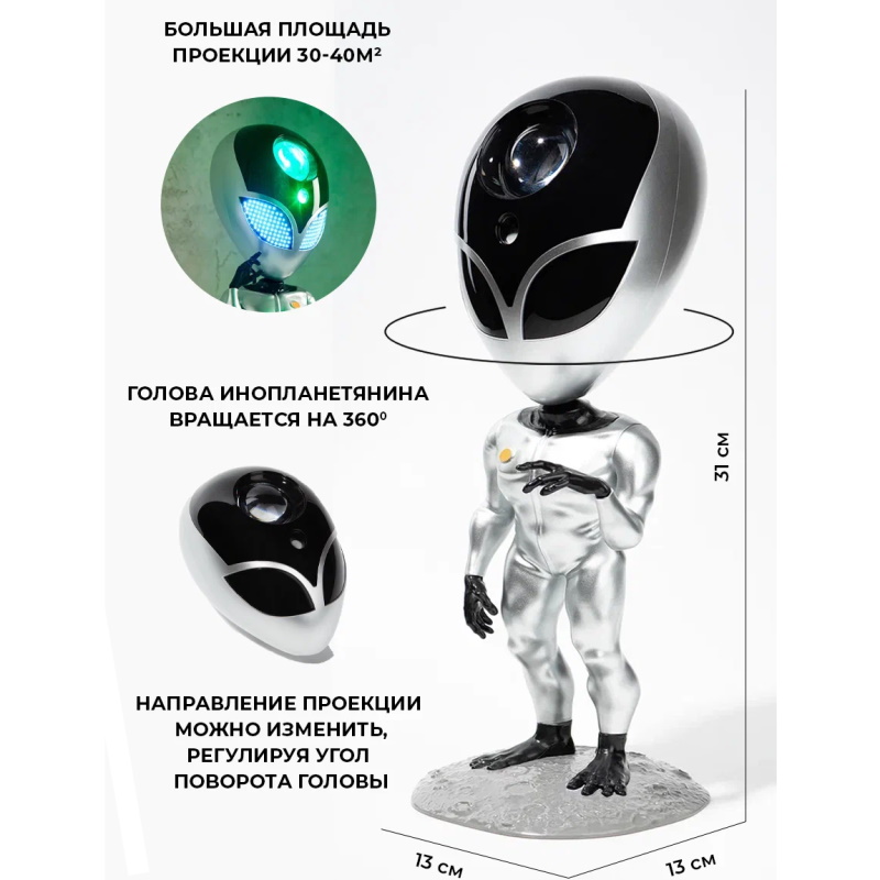Детский ночник в виде инопланетянина станет необычным украшением для комнаты и не оставит равнодушным как взрослых, так и детей. Домашний планетарий - это небольшое устройство, выполненное в оригинальном дизайне Инопланетянина, которое проецирует изображение неба и звезд на стену и потолок в доме.
