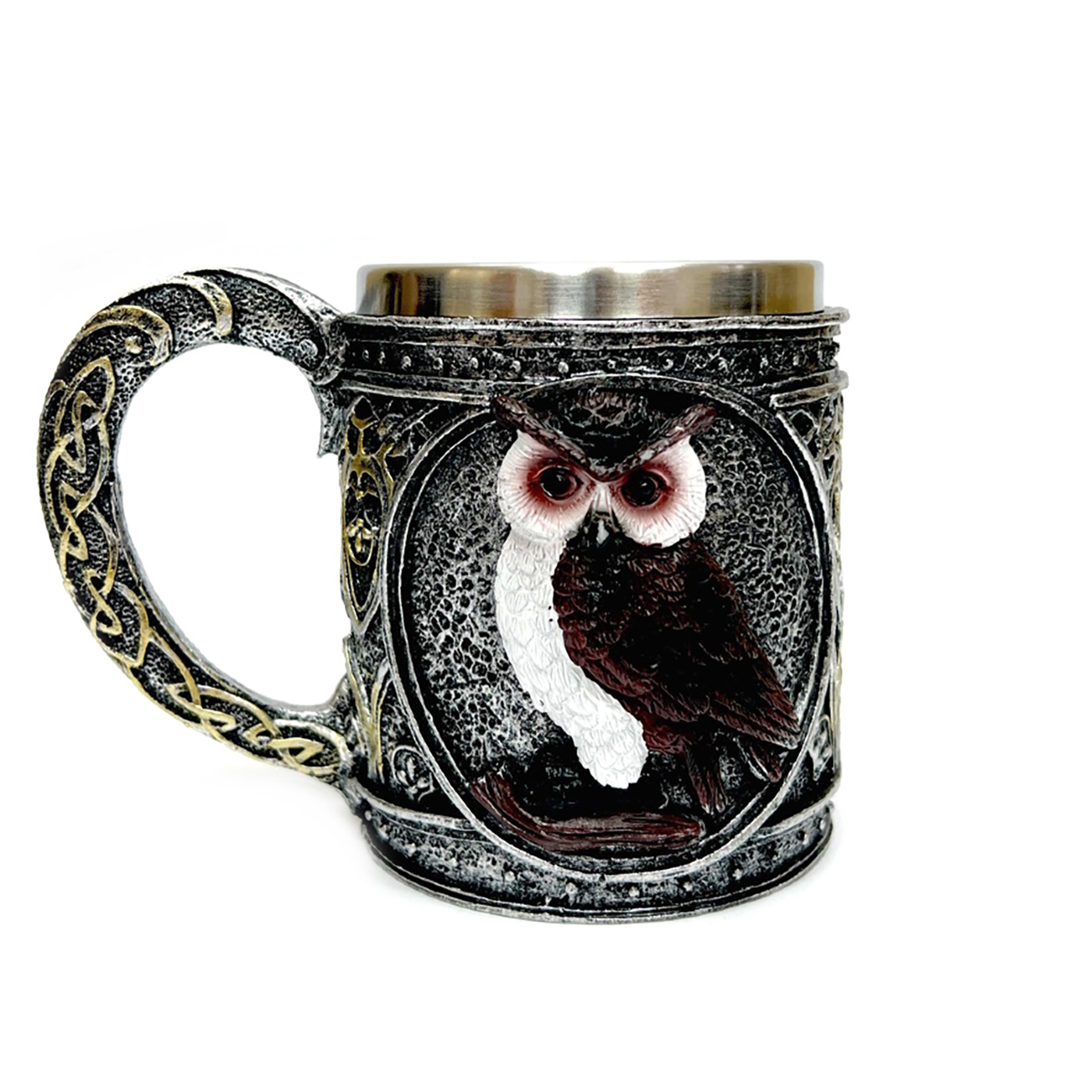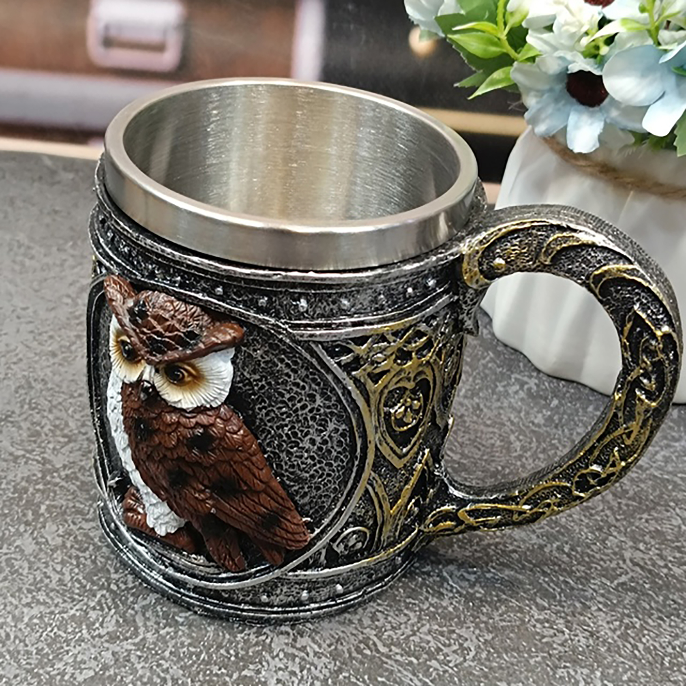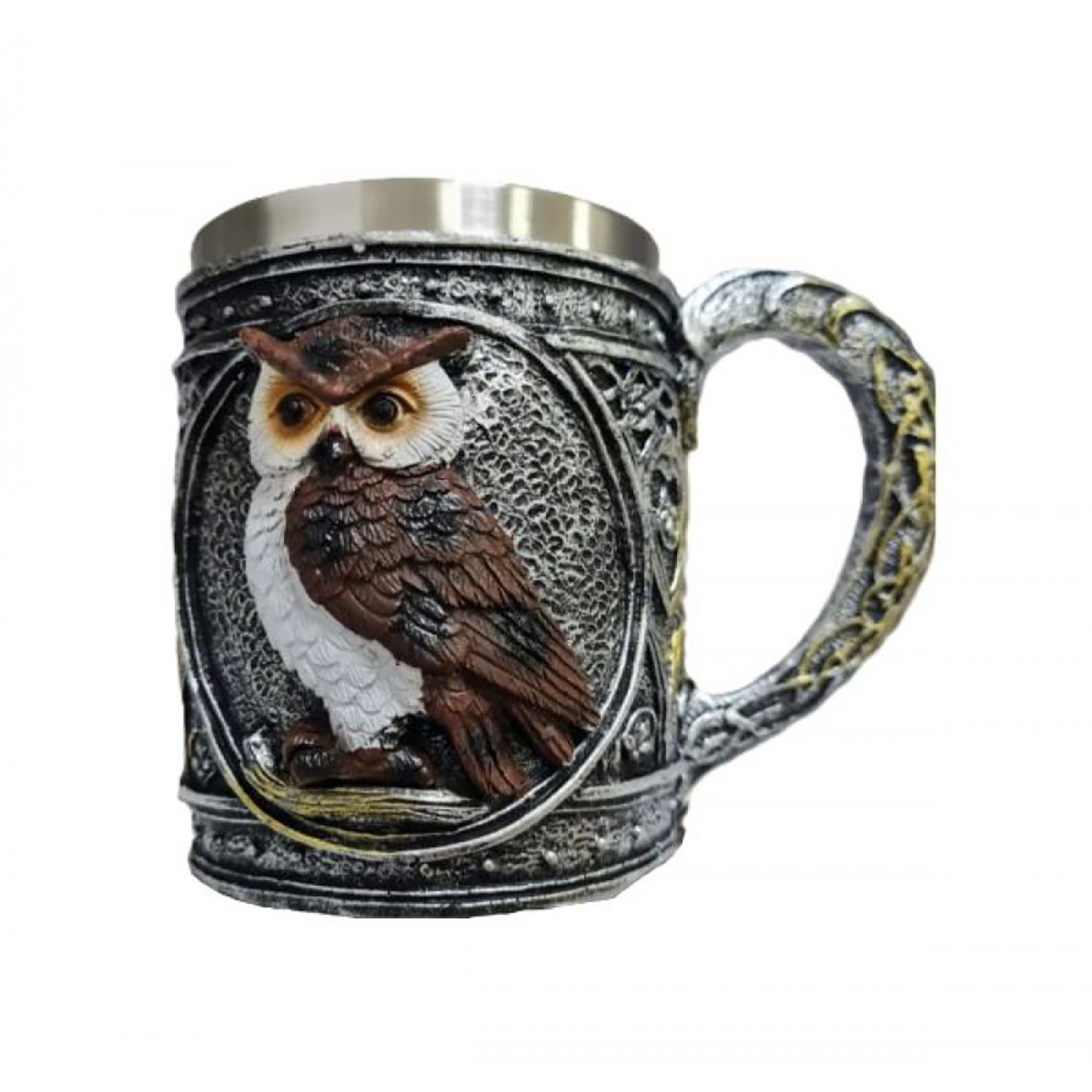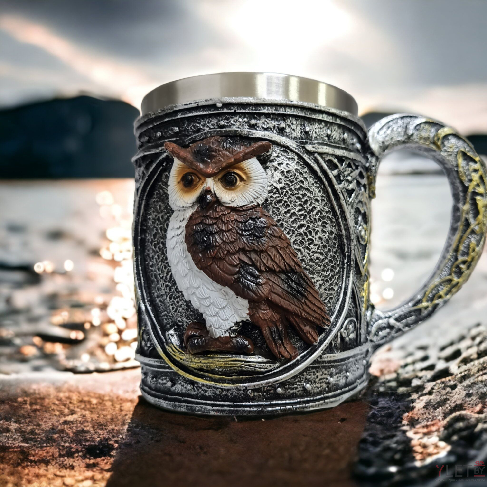 Кружка "Сова" привлекает внимание своим оригинальным дизайном и яркими деталями. Удобная ручка обеспечивает надежный хват, а прочный металл способствует долговечности.