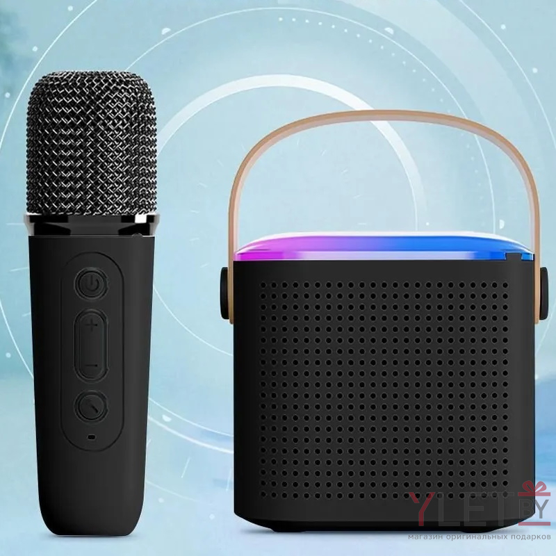 Мини колонка, беспроводной микрофон, индивидуальная регулировка громкости для каждого, выход для наушников, слот под micro-SD карту памяти, акустика и микрофон работает от встроенного аккумулятора, удобная ручка для транспортировки.На верхней панели колонки расположены 4 кнопки: 1,2. увеличение/уменьшение громкости или, при удержании, переход к следующему/предыдущему треку; 3. кнопка включения/выключения или при однократном нажатии воспроизведение/пауза трека; 4. кнопка M, которая отвечает за переключение между разъёмами Bluetooth, AUX, micro-SD картой памяти или, при двойном нажатии на эту кнопку, сменяется цвет и ритм подсветки, для отключения подсветки нажмите и удерживайте несколько секунд эту кнопку. При воспроизведении трека подсветку можно только отключить или включить один вариант. На задней панели расположены: выход джек 3.5 мм. для наушников или более мощную акустику, вход под карту памяти micro-SD для воспроизведения аудио файлов, гнездо для зарядки акустики Type-C. Удобная ручка для транспортировки выполнена из ЭКО кожи коричневого цвета. Сам динамик выполнен из прочного пластика.