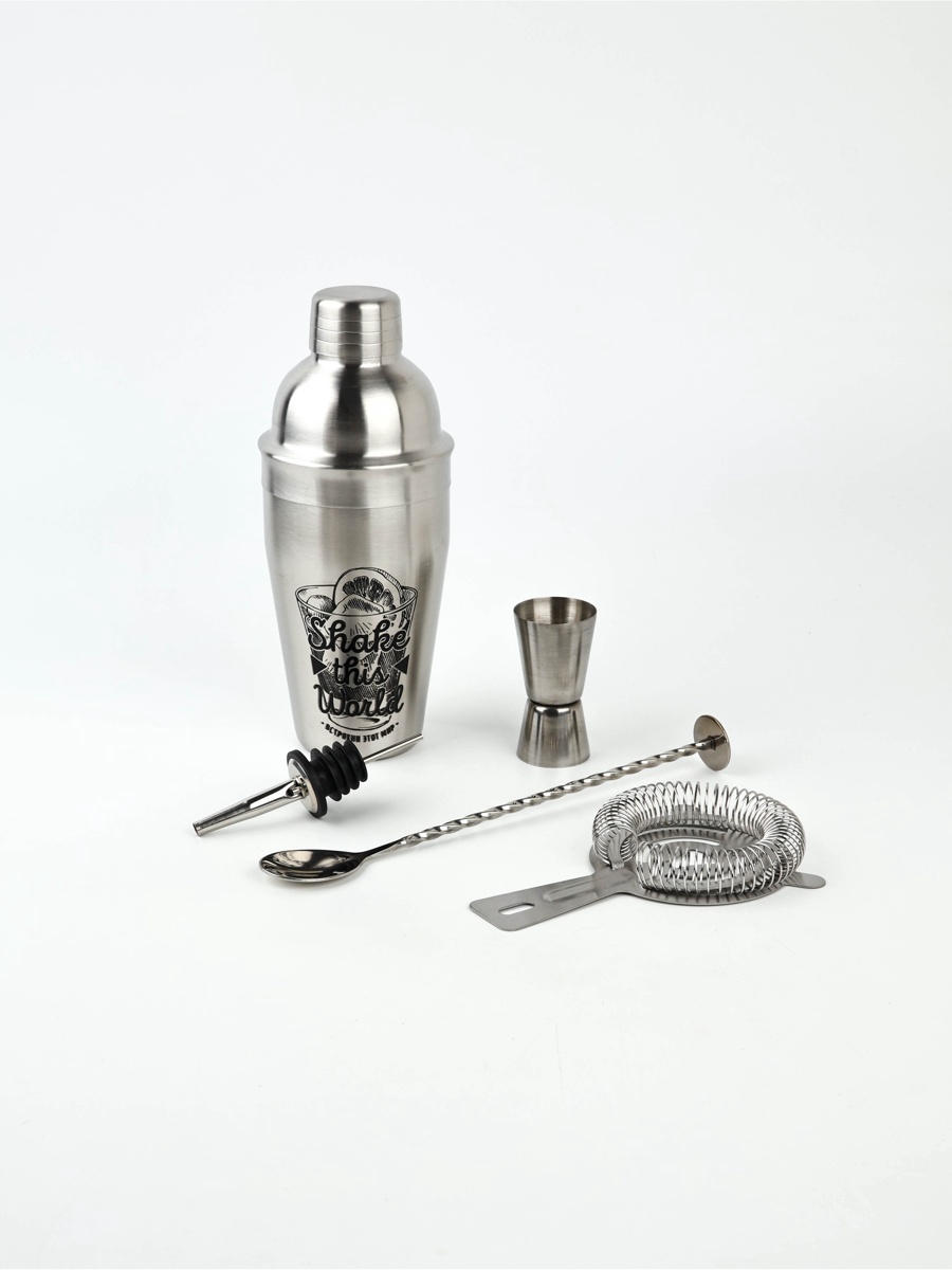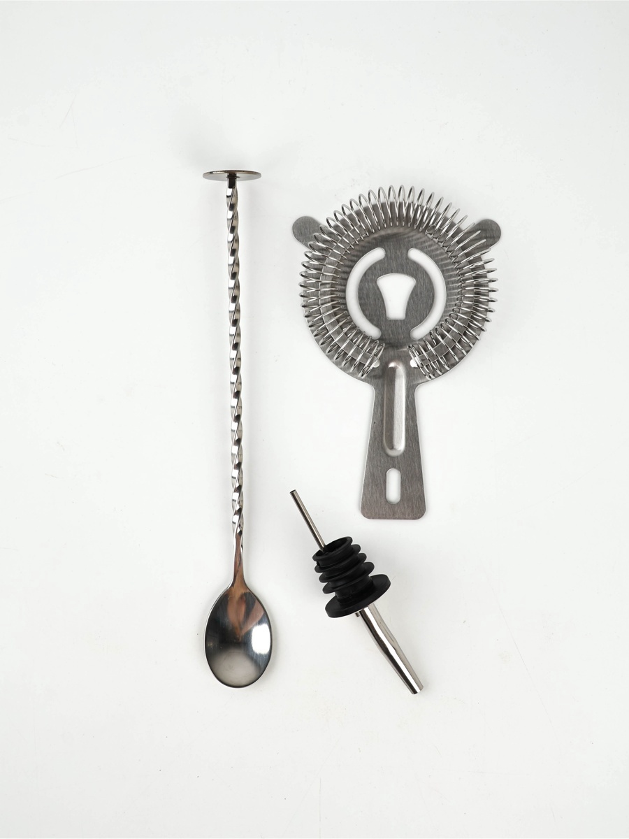 Барный набор включает в себя обязательный инвентарь для приготовления коктейлей: