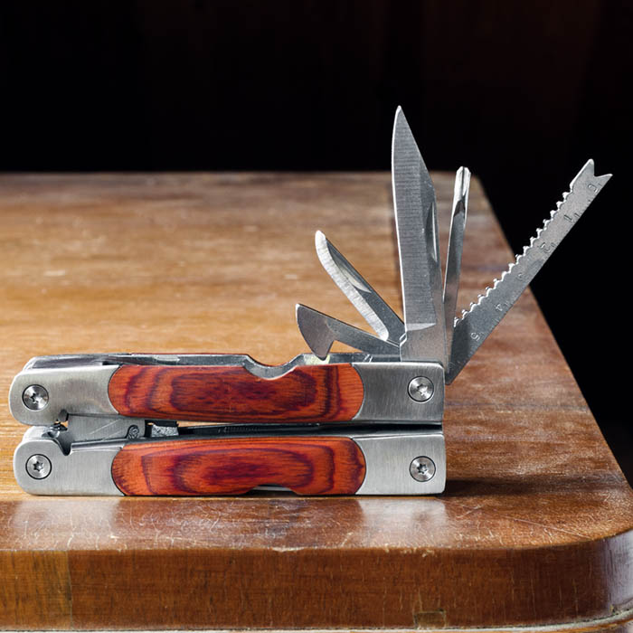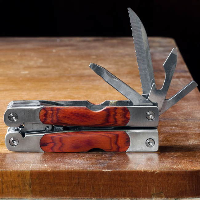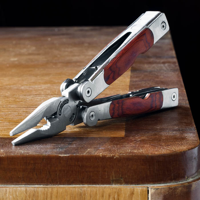 Мультитул удобно хранить и переносить в черном чехле, который закрывается с помощью клапана на липучке. Возможно закрепить такой чехол на тактической экипировке, чтобы мультитул был под рукой.Материал: нержавеющая сталь, дерево.