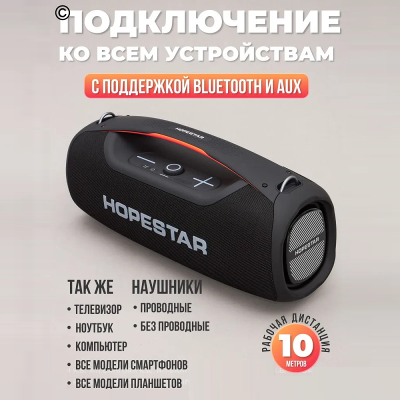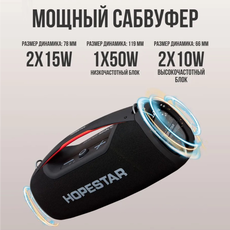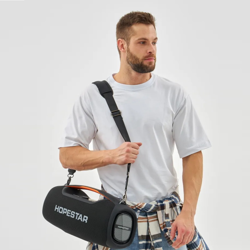 Колонка Hopestar A60 - это стильная и мощная новинка от бренда качественных Bluetooth колонок с великолепным, насыщенным звучанием. Модель Hopestar A60 выполнена из прочного пластика с Soft Touch покрытием, а лицевая часть и динамики надежно защищены синтетической тканью, а кнопки управления прорезинены и нажимаются с отчетливым кликом.
