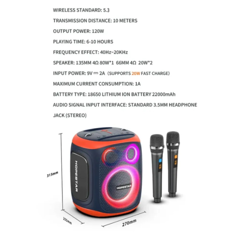 Колонка Hopestar Party 130 - новая портативная колонка оснащена новым Bluetooth 5.3 и емкостью аккумулятора 22000 мАч, что обеспечивает до 8 часов непрерывного воспроизведения музыки без подзарядки. Она имеет LED подсветку и объемный звук для полного погружения в музыку.