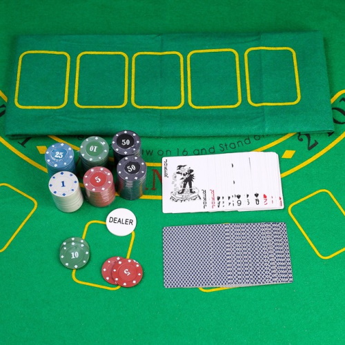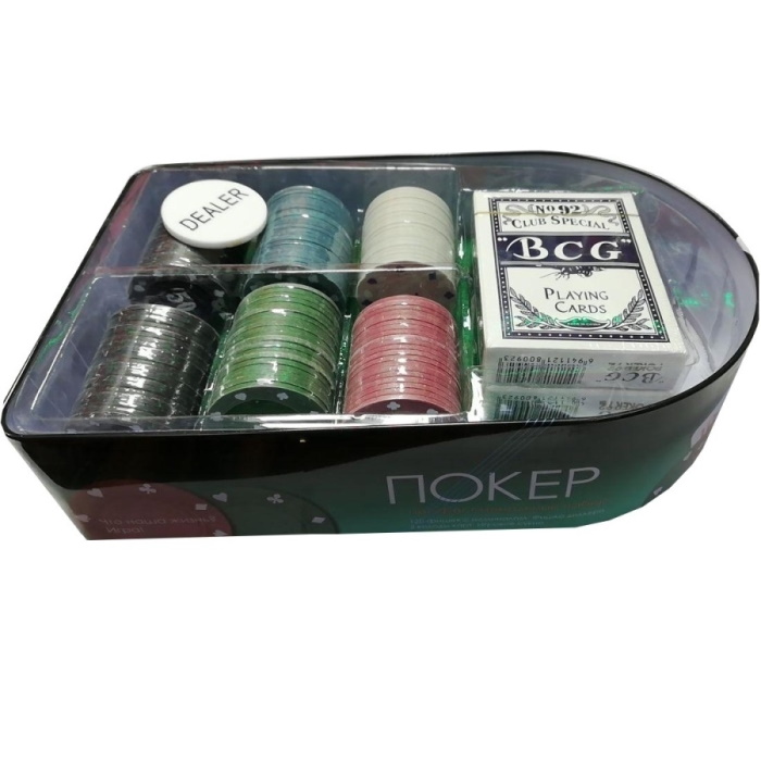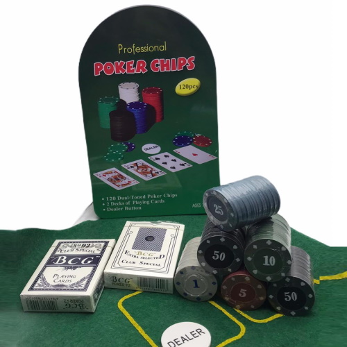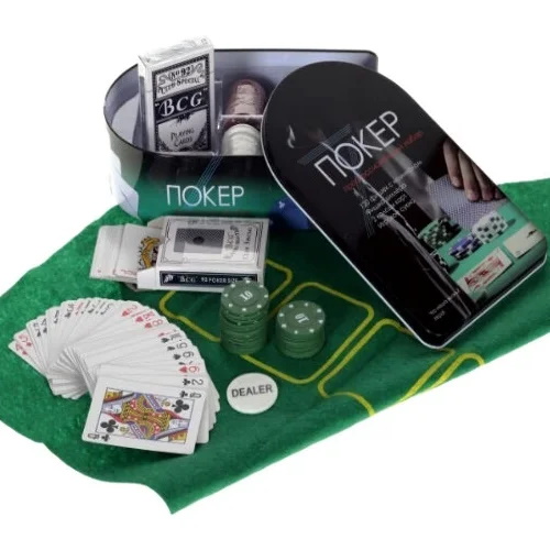 - В комплекте: 120 фишек с номиналом, фишка дилера, 2 колоды карт, игровое сукно.