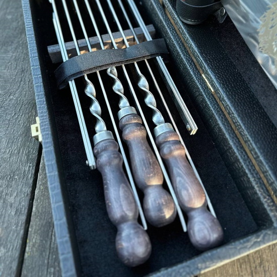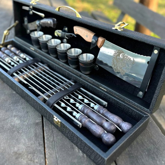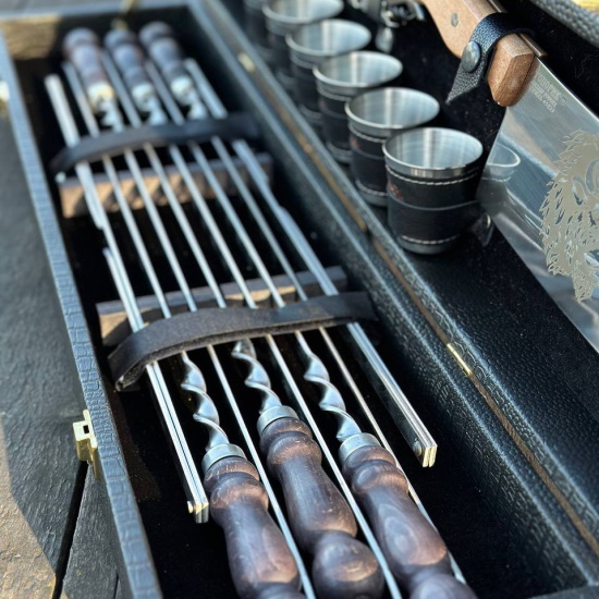 Подарочный шашлычный набор станет достойным презентом для близких, друзей, партнёров и руководителя. Мы предлагаем шашлычные наборы отличного качества, которые будут радовать Вас на протяжении долгих лет. Шашлычный набор стoит купить мужу, друзьям, начaльнику - шeфу или коллеге пo рaбoте!Комплектация: