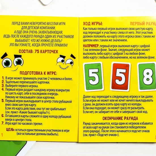 Главная задача игроков – как можно быстрее избавиться от своих карт. И, естественно, не обойдётся без карт, которые могут усложнить участникам игру… Например, взять несколько дополнительных, пропустить ход и не только.Комплектация: