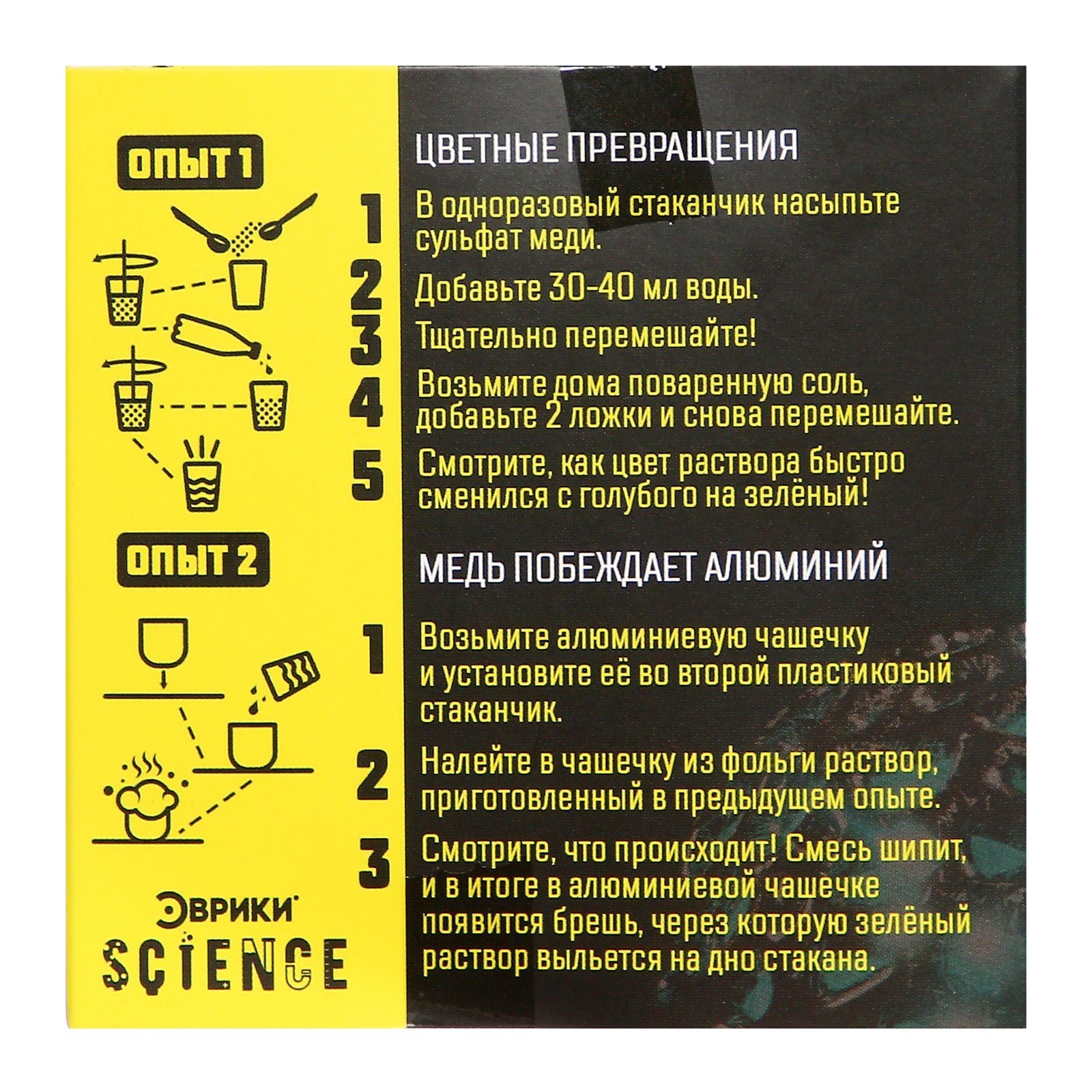 С набором для опытов «Эврики» ребёнок узнает об удивительных свойствах веществ, проведёт два увлекательных эксперимента и удивит друзей.