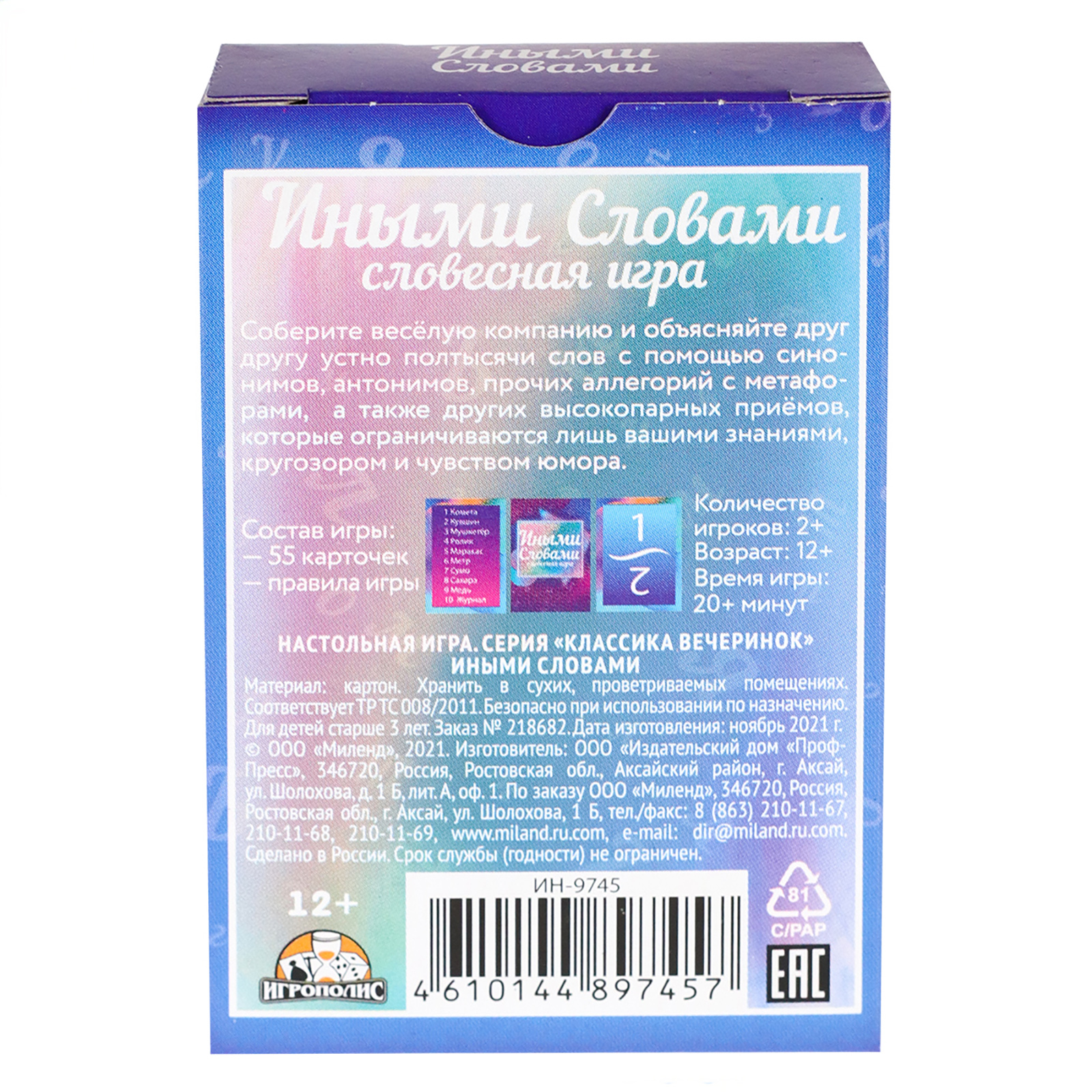 Приготовьтесь к увлекательному взаимодействию с настольной карточной игрой «Иными словами»! Эта игра станет отличным развлечением для всей семьи, включая как детей, так и взрослых, и подарит много радостных моментов и смеха.