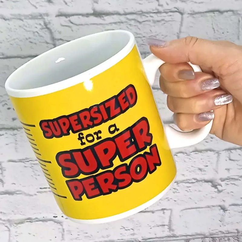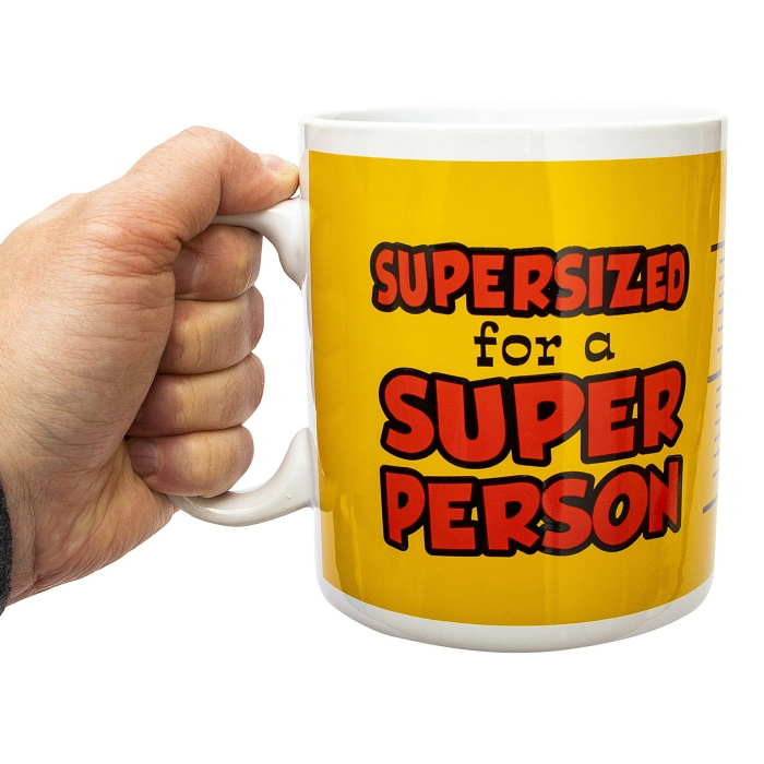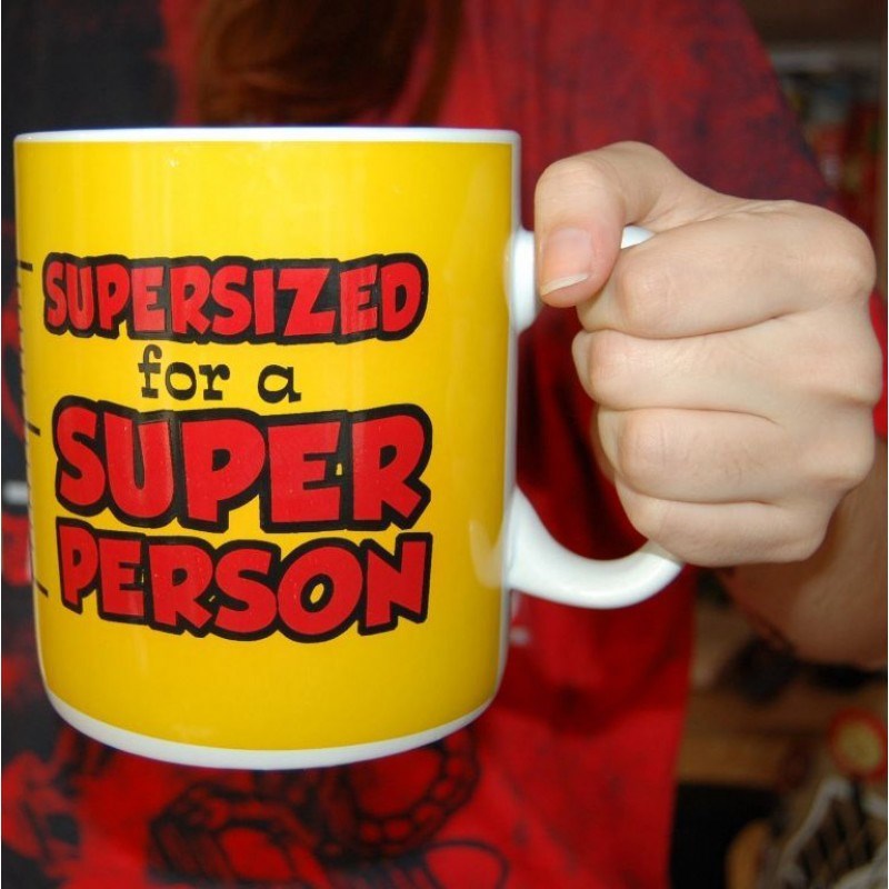 Большому кораблю — большое плавание! А, нет, что-то не то. Вот как правильно: большому человеку — большая кружка! Причем «большому» — это не обязательно относится к размерам. Можно быть хрупкой девушкой и все равно отлично смотреться с купленной в магазине Мистер Гик Гигантской кружкой Supersized for a Super Person.