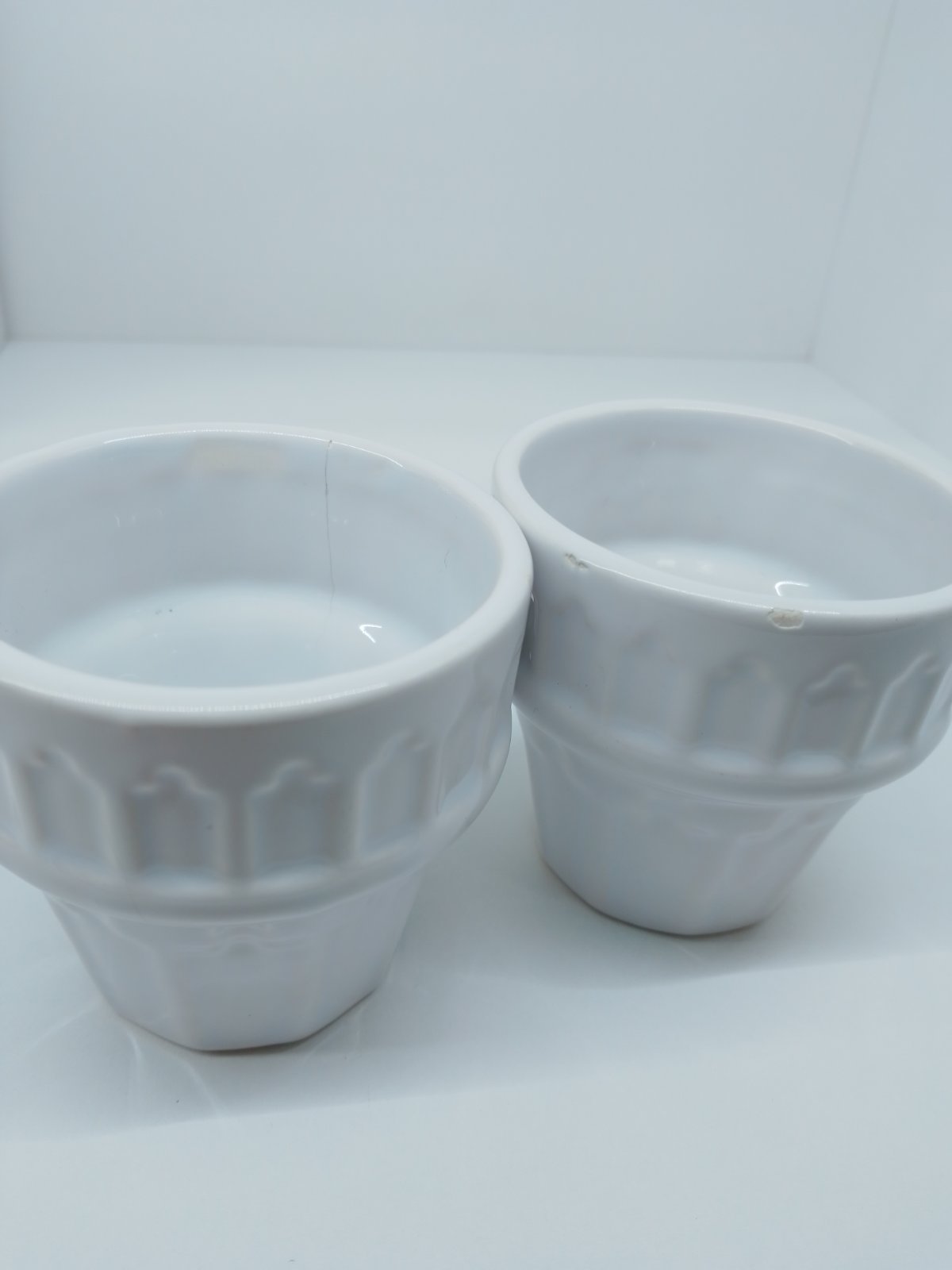 ОПИСАНИЕ ДЕФЕКТА: мелкие сколы эмали по краям чашки, трещина на одной чашке (фото).