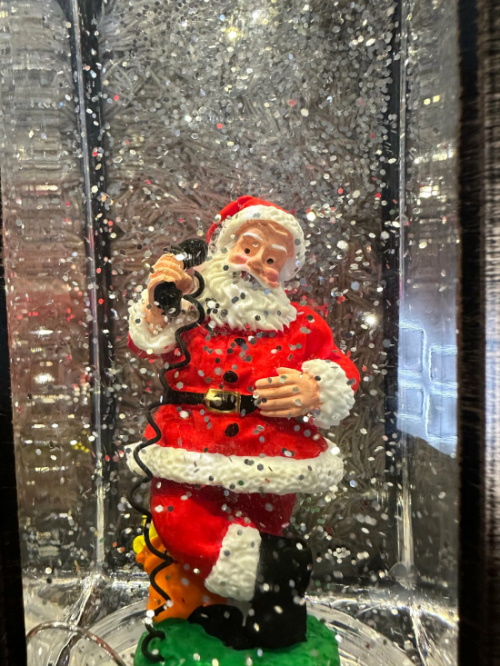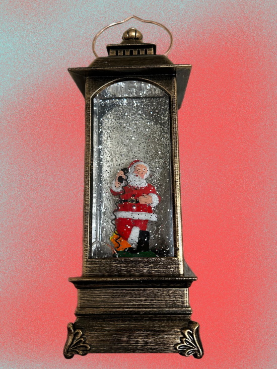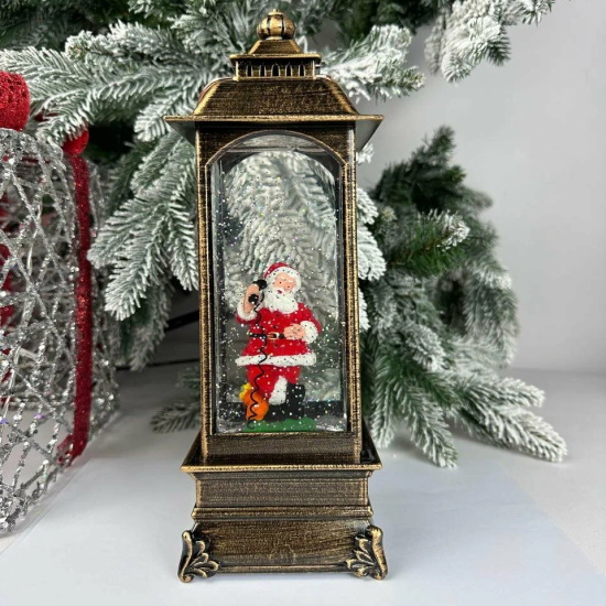 Снежный музыкальный Ретро фонарь квадратный "Дед мороз с телефоном" 9.5х9.5х30 см