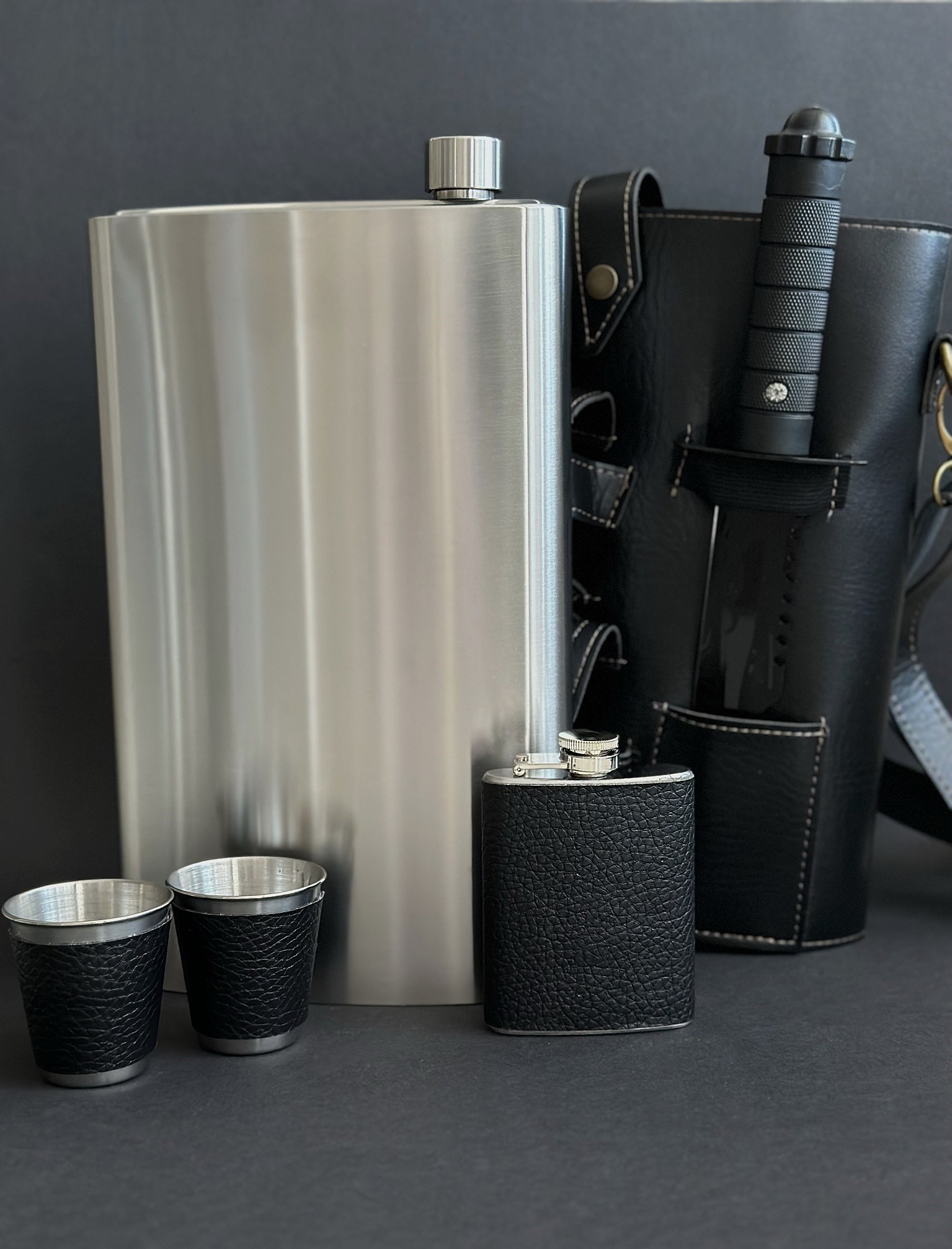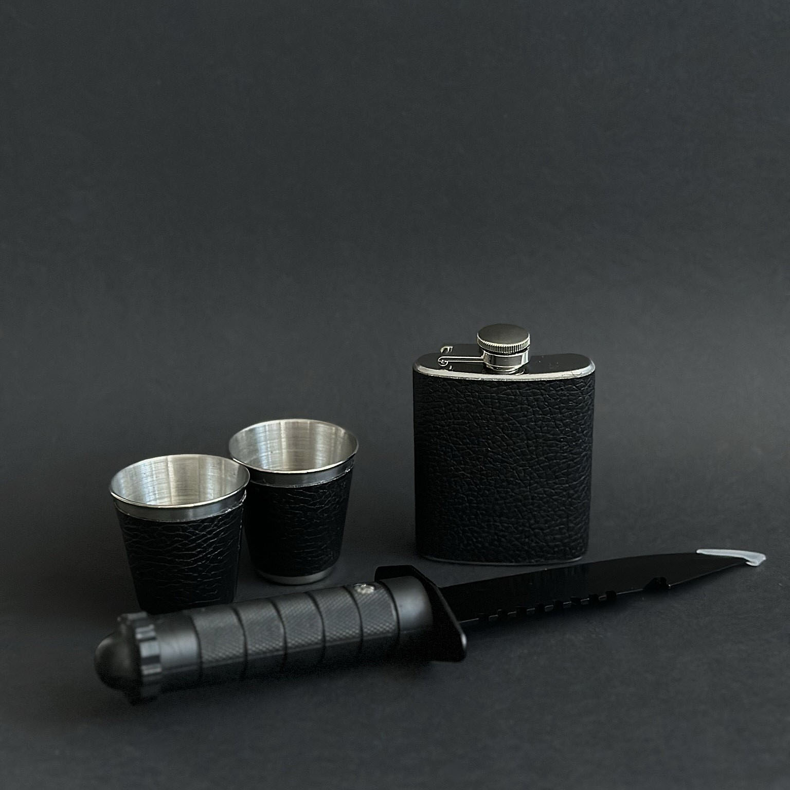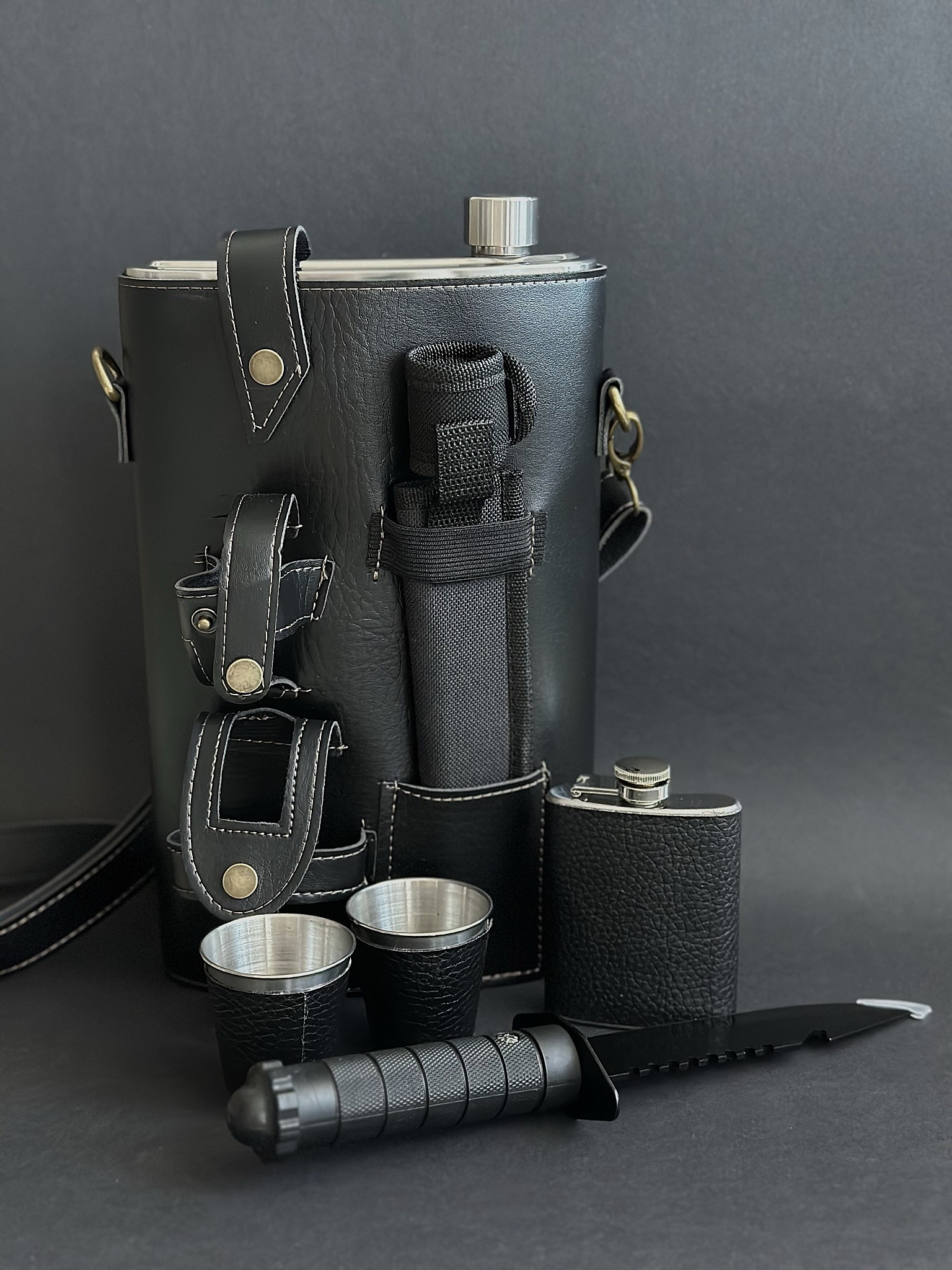 Независимо от того, отправляетесь ли вы в долгий поход, на пикник с друзьями или просто на выходные за город, наш набор обеспечит вам комфорт и удобство. Большая фляжка вместит ваши любимые напитки, а компактная фляжка — это идеальный вариант для коротких походов или для пополнения запаса. Стопки позволят наслаждаться напитками в любой компании, а многофункциональный нож станет незаменимым помощником в приготовлении пищи и решении различных задач на природе.Состав набора: