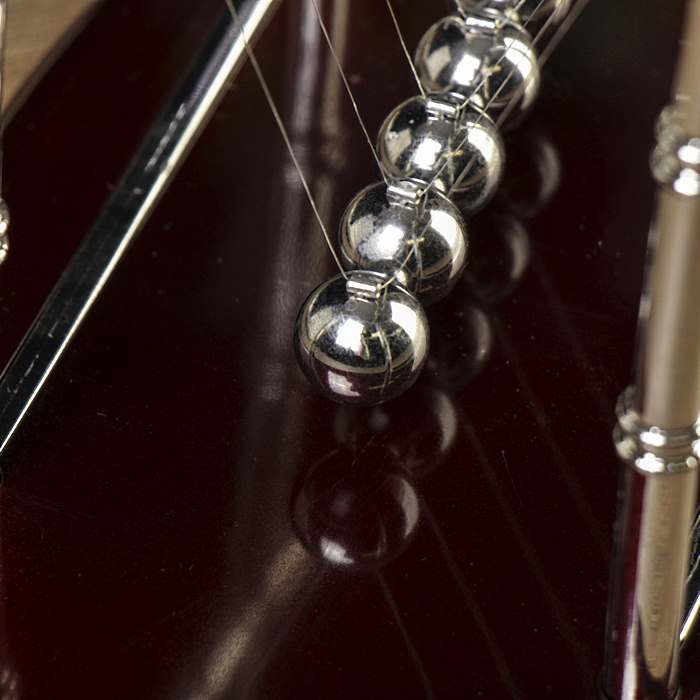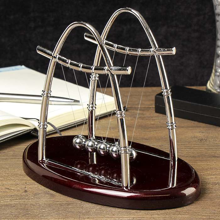 Необыкновенные шары Ньютона - помогут избавиться от стресса, сосредоточиться на важной мысли или, наоборот, расслабиться и отдохнуть под мерное движение шариков. Маятник Ньютона представляет собой предмет для визуализации физических процессов - закон сохранения энергии и закон сохранения импульса.Один из таких настольных антистрессов из ряда сувенирных «вечных двигателей» называют «Шары Ньютона». Эта игрушка, конечно, не зарядит ваш мобильный телефон или ноутбук, зато у нее занимательная конструкция, а еще ею просто приятно любоваться.Оригинальный настольный сувенир "Шары Ньютона" - это наглядный пример закона сохранения энергии, открытый Исааком Ньютоном. "Колыбель Ньютона" наверняка известна вам из уроков физики, где вам демонстрировали такую модель. Маятник ньютона состоит из пяти металлических шариков, подвешенных на тонкой леске к двум п-образным рамкам и своим движениям и синхронным стуком расслабляют и помогают отвлечься от негативных эмоций. Достаточно отвести и отпустить один из крайних шариков, и вы сможете наблюдать в действии физический закон сохранения энергии - с противоположной стороны шарики станут двигаться в том же ритме и зеркальном отображении.Небольшая настольная кинетическая скульптура в собранном виде демонстрирует закон сохранения энергии, открытый Исааком Ньютоном. Завораживающее медитативное постукивание блестящих шаров на Вашем столе поможет сосредоточиться при обдумывании или наоборот, расслабиться после тяжелой работы. Движение – это жизнь!Этот сувенирный вечный двигатель "Маятник Ньютона" можно преподнести в подарок бизнесмену, который на работе постоянно нервничает, или тем, кто просто любит иногда отключиться от окружающей суеты и хотя бы ненадолго уйти в свои мысли.