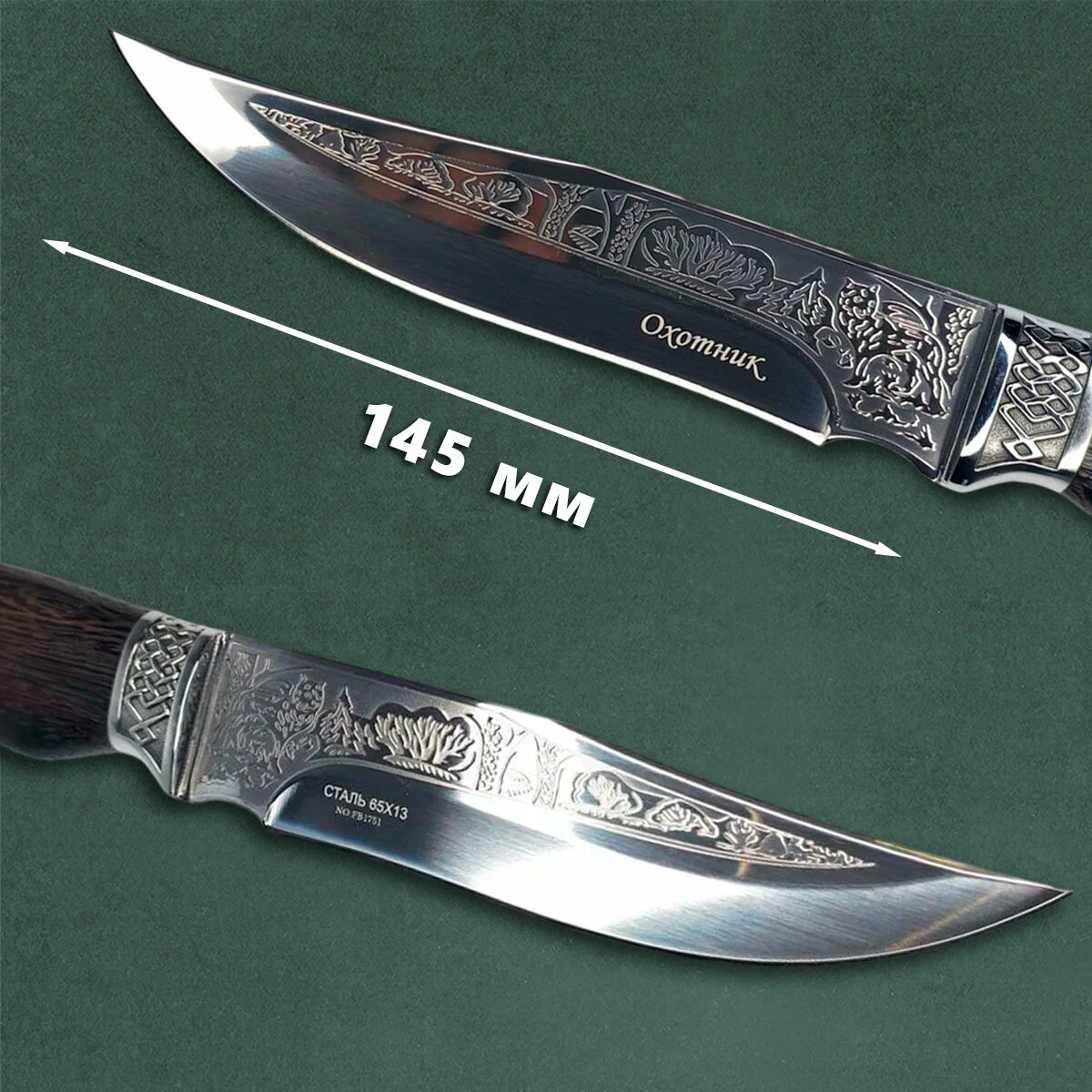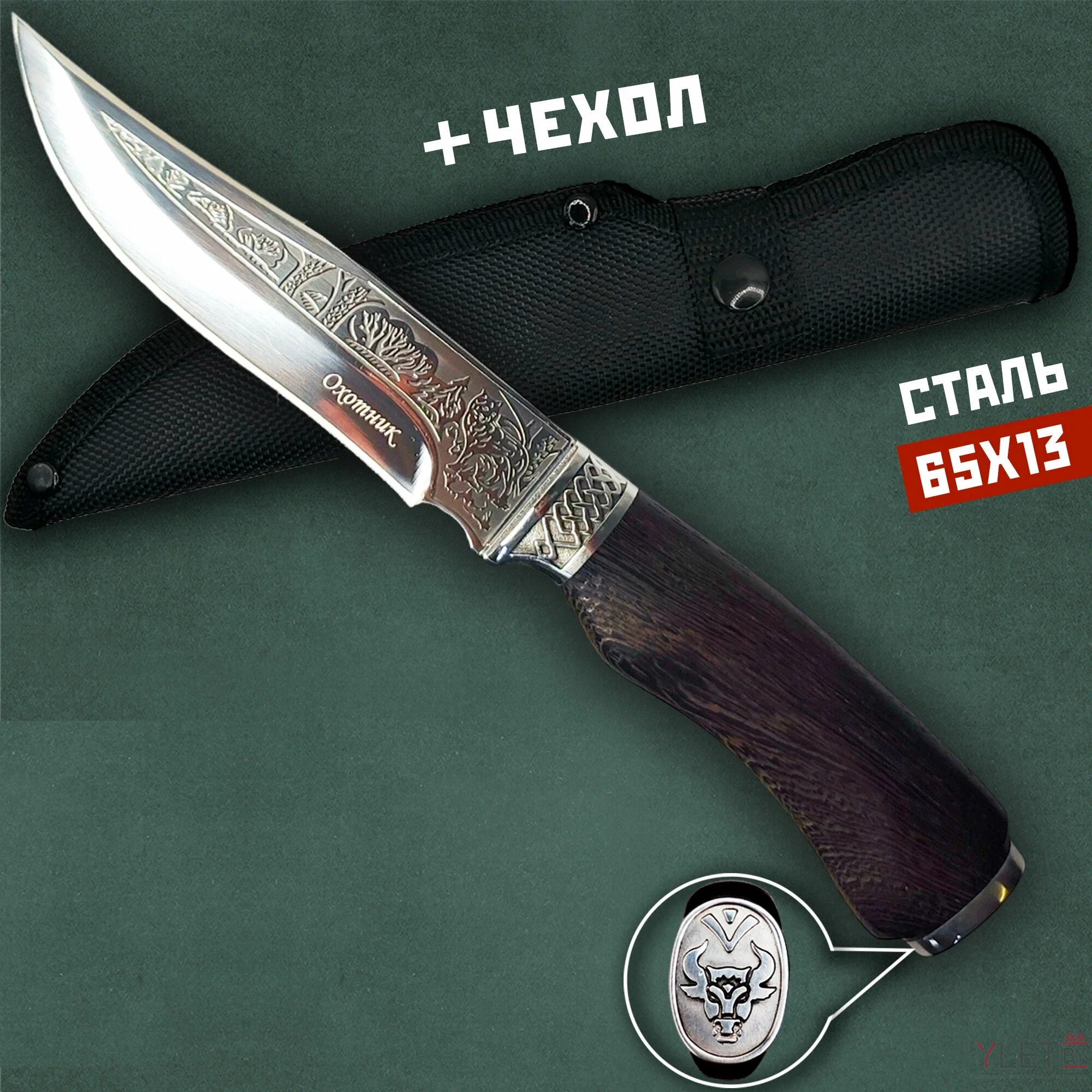 Туристический нож Охотник с прямой рукоятью и фиксированным клинком идеально подходит для охоты, рыбалки и туризма, ручная работа. Качество ножа на высшем уровне, изготовлен из пакетов сплошной нержавеющей стали марки - 65х13. Ручная заточка острая как бритва. Нож имеет оригинальный, стильный вид и смотрится очень красиво.