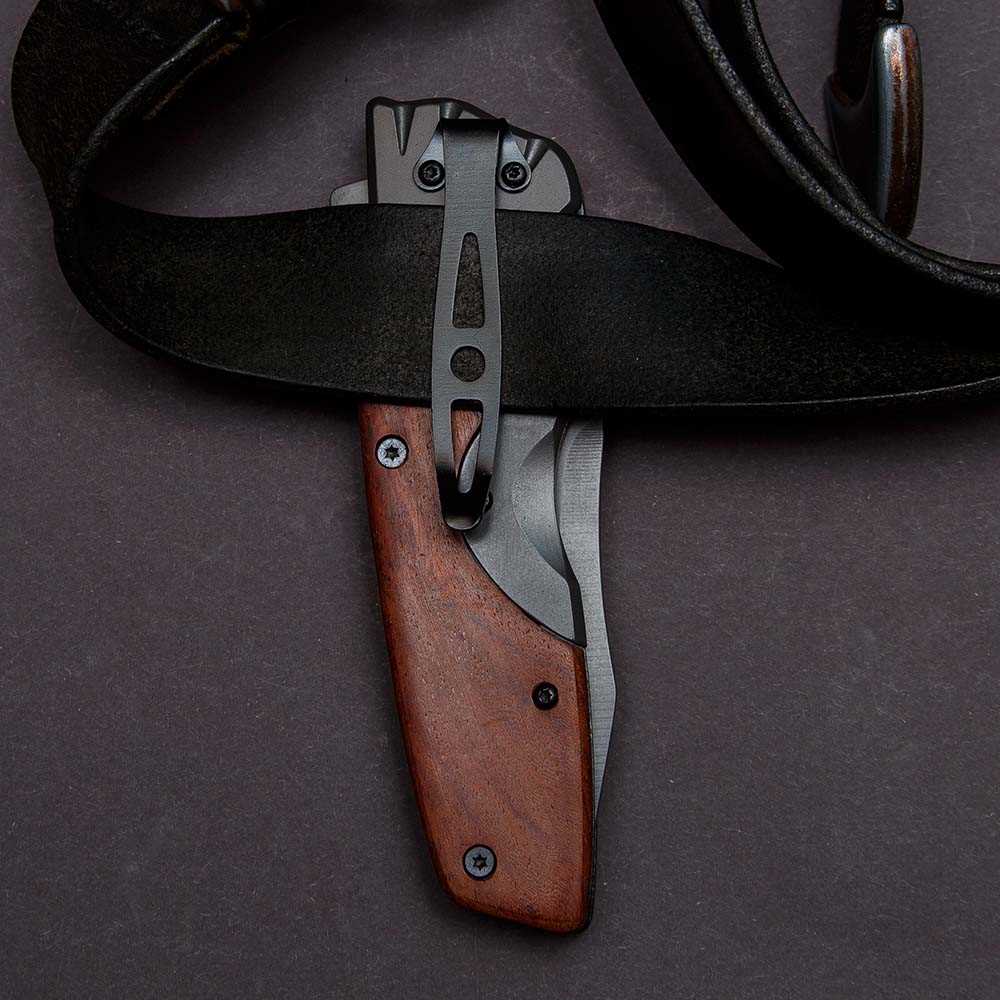 Его можно удобно закрепить в кармане или на ремне, благодаря стальной клипсе на внутренней части рукояти. Применение ножа комфортно и безопасно. Нож так же укомплектован темляком из парокорда. Благодаря рамной конструкции и качественной сборке, механизм ножа надежен в работе.