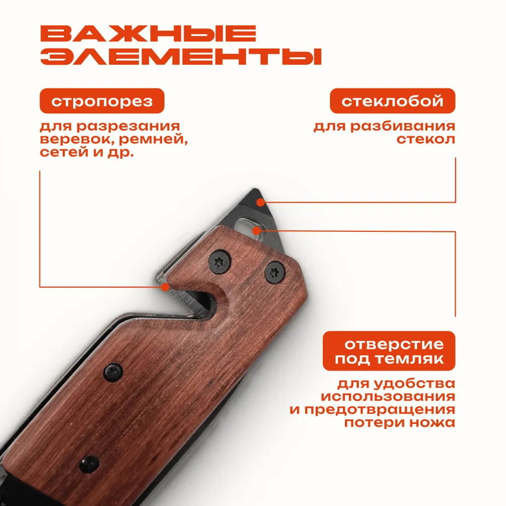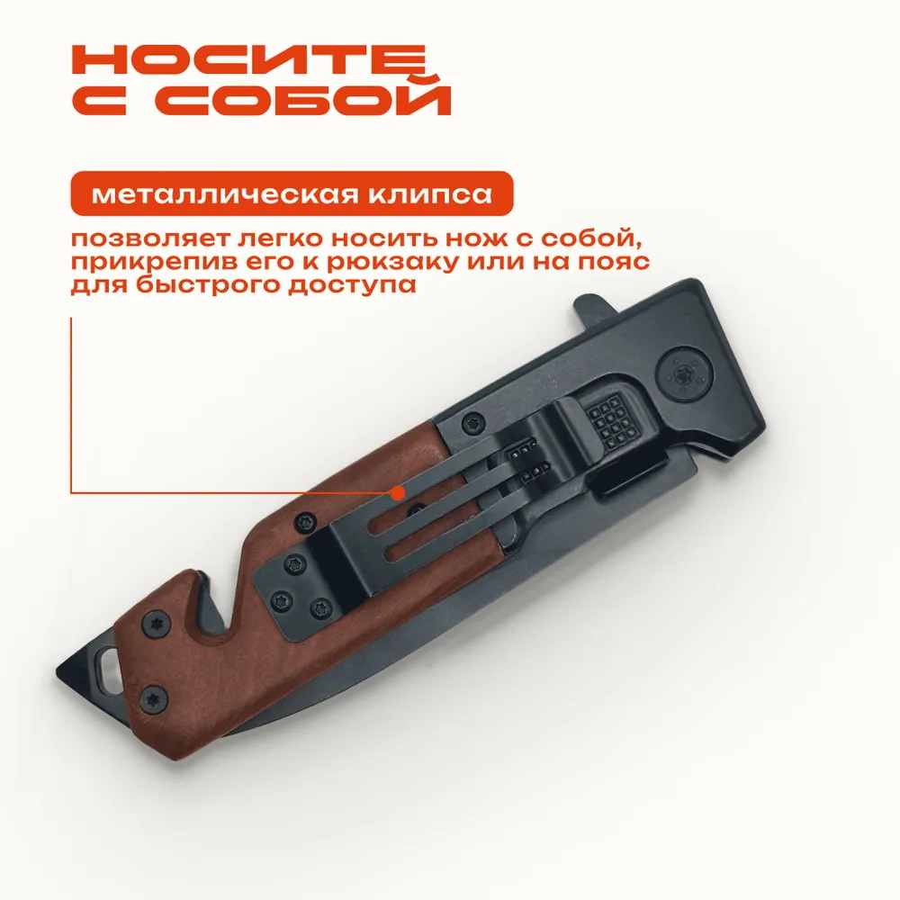 Этот складной нож — идеальный инструмент для активного отдыха, приключений и путешествий. Компактный и универсальный, он отлично подходит для кемпинга, охоты, рыбалки и туризма. Эргономичная рукоять обеспечивает комфортное удержание, делая использование ножа удобным. Стропорез предназначен для разрезания тросов, веревок и других материалов. Стеклобой на рукояти позволяет быстро разбить окно или иную стеклянную преграду, обеспечивая доступ или создавая выход в экстренных ситуациях. Лезвие из нержавеющей стали с титановым покрытием обладает высокой устойчивостью к коррозии. Оно не тускнеет, не окисляется и сохраняет свою износостойкость. Прямое лезвие универсально и легко затачивается. Весом всего 230 граммов, нож легко носить с собой в кармане или рюкзаке. Металлическая клипса позволяет крепить его на ремень, одежду или рюкзак для быстрого доступа. Стильный и брутальный дизайн делает его прекрасным подарком для охотника, рыбака, грибника, лесника, военного или любителя активного отдыха. Это настоящий мужской подарок, сочетающий функциональность и эстетическую привлекательность.