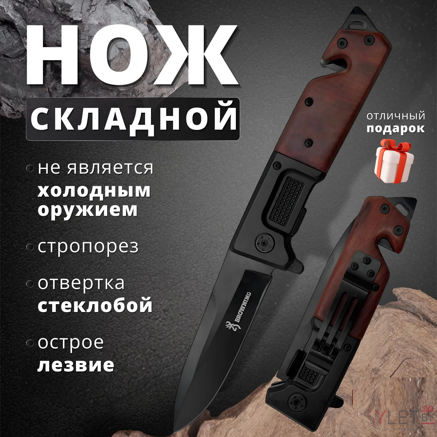 Нож механический под дерево Browning цвет черный металл с рельефной вставкой в коробке