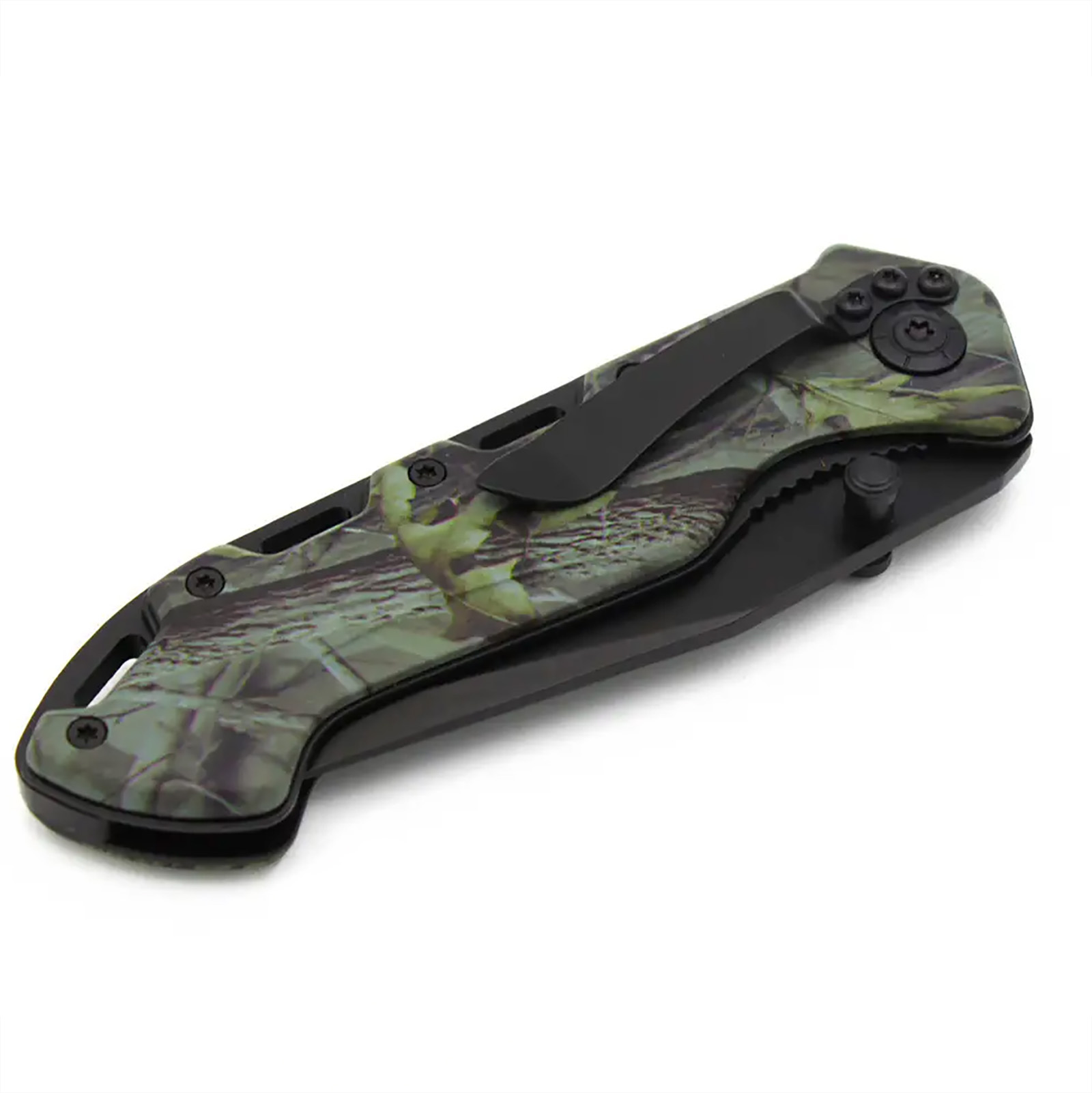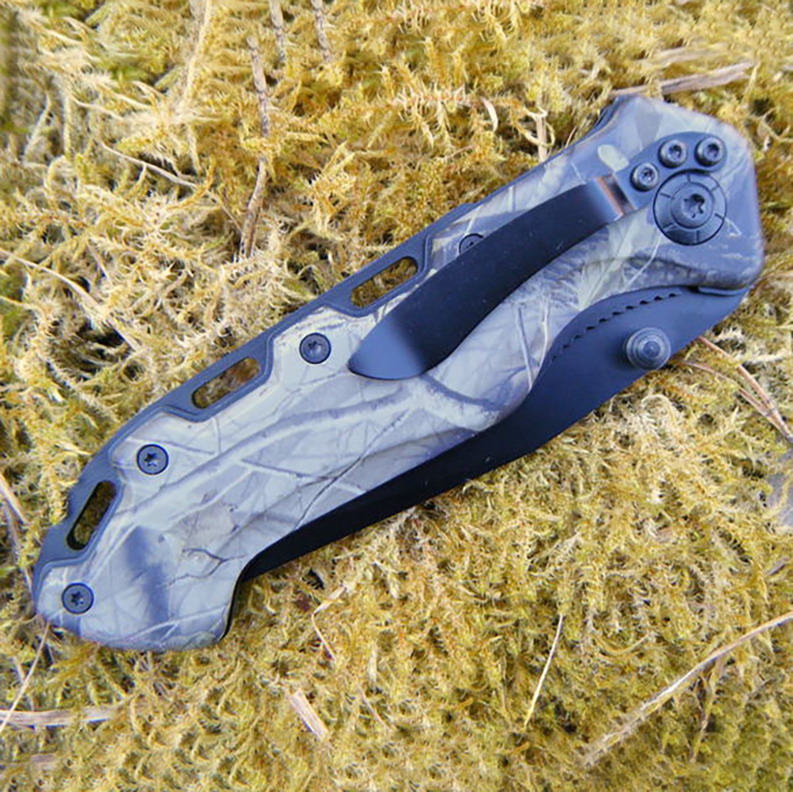 Эргономичная рукоятка с камуфляжным дизайном обеспечивает надежный и комфортный хват. Механизм быстрого открытия позволяет использовать нож одной рукой, что особенно полезно в экстренных ситуациях.