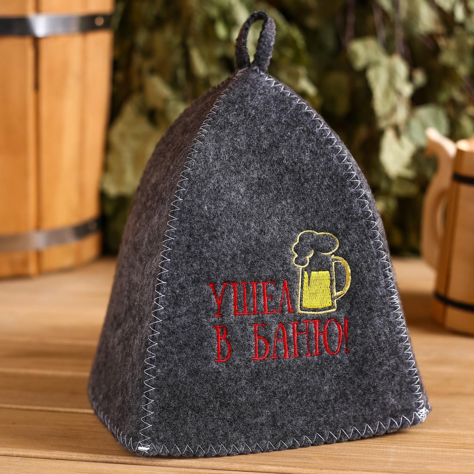 - Банная шапка с вышивкой «Ушёл в баню»: защитит вашу голову от перегрева и убережет волосы от ломкости, сохраняя их здоровье во время парной.