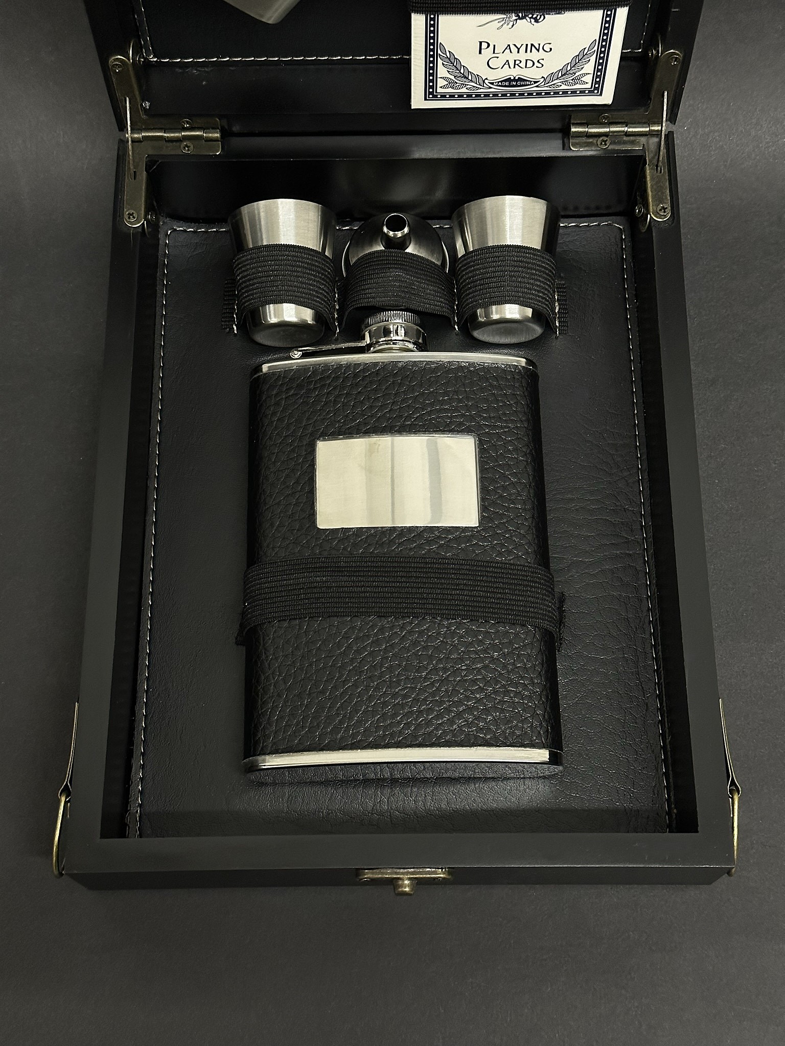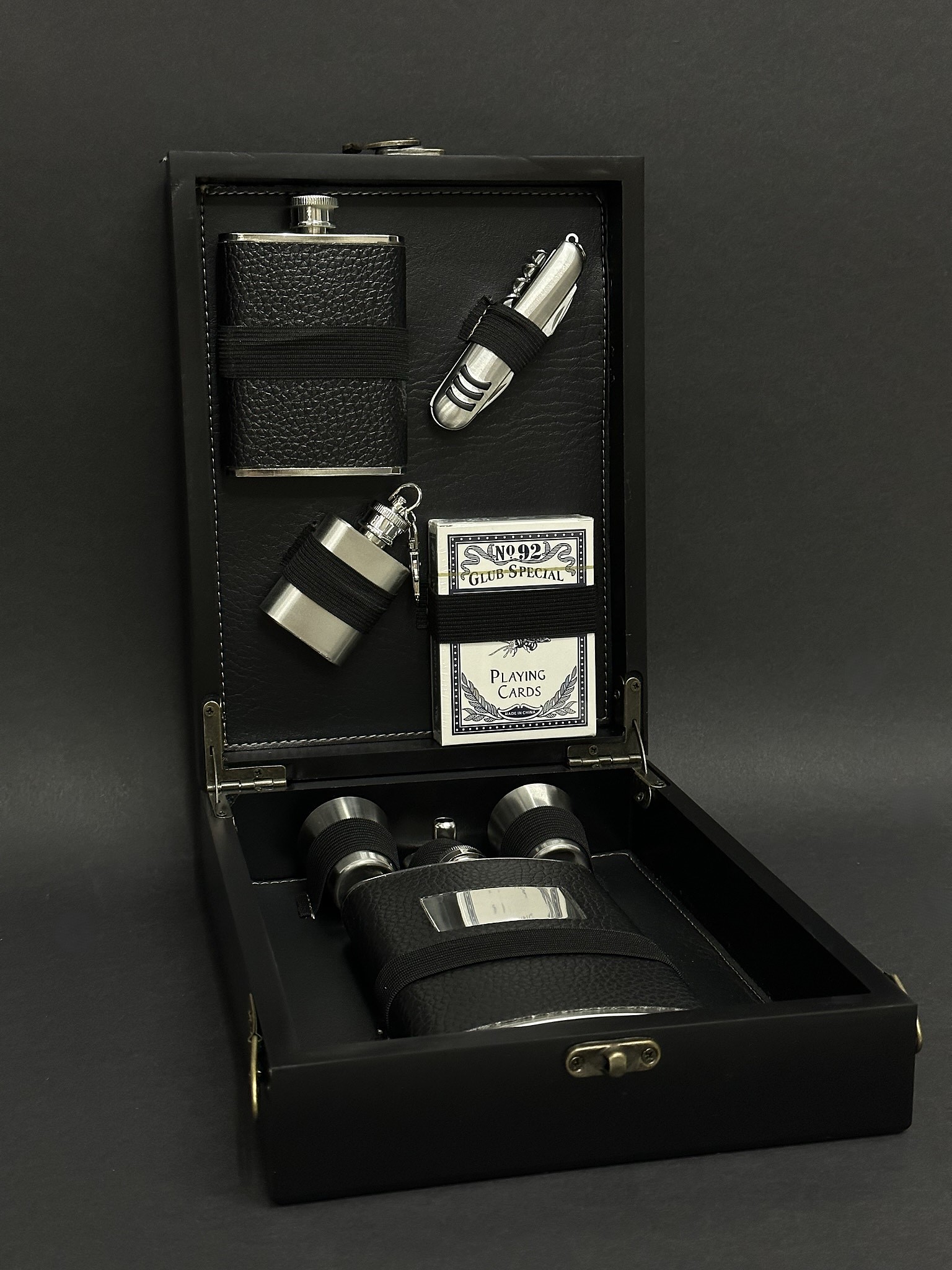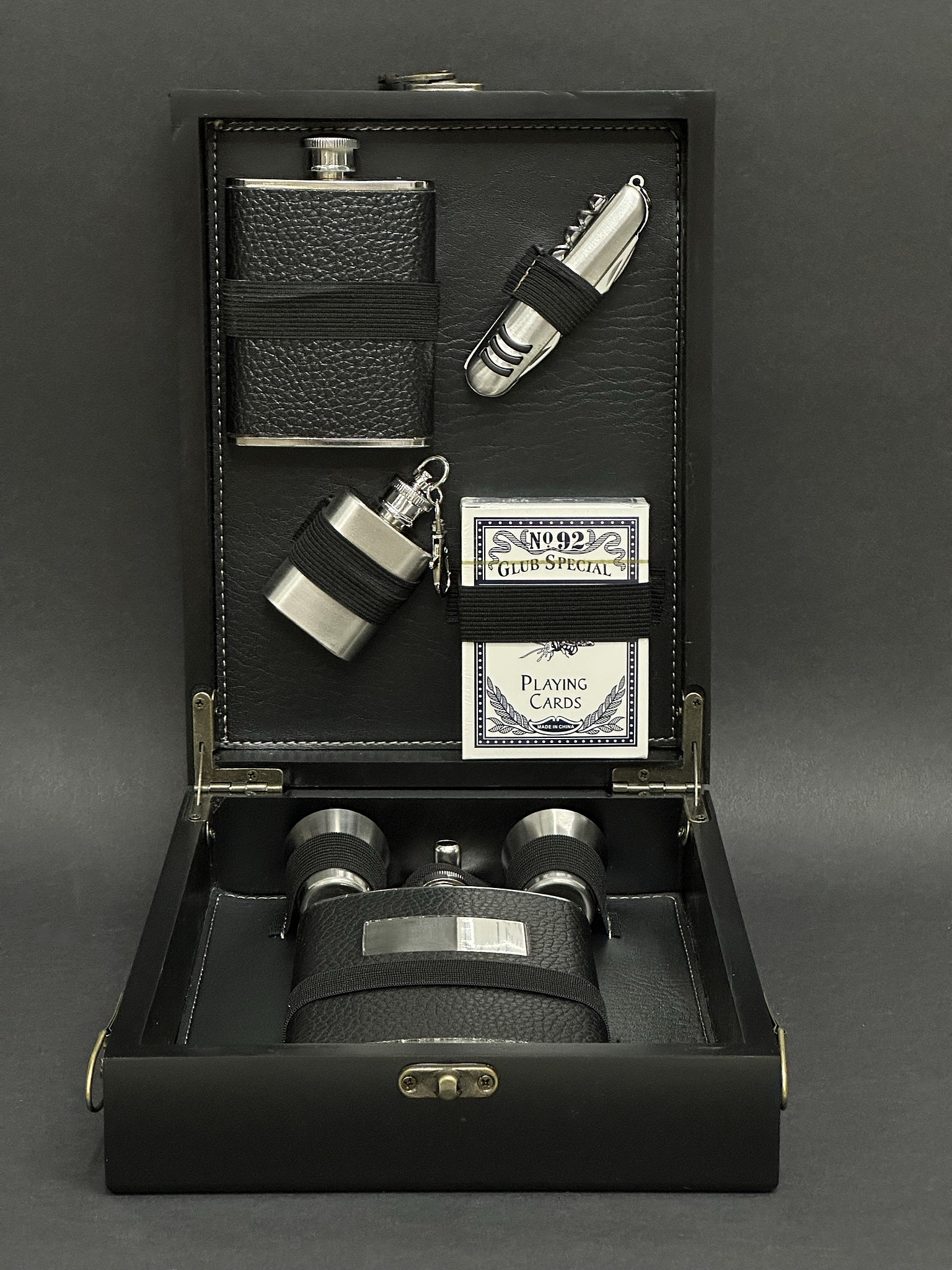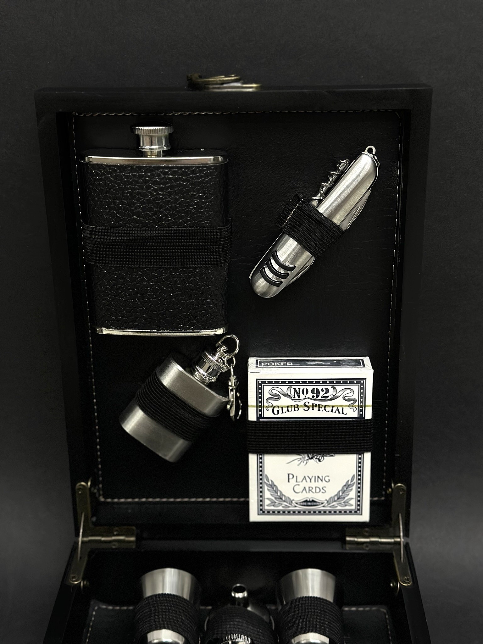 Набор подарочный (7 предметов) 23-MH-5 (Фляжка 9oz, фляжка 7oz, фляжка брелок 1 oz, мультитул, карты 2 стопки, лейка, ремень для переноски)