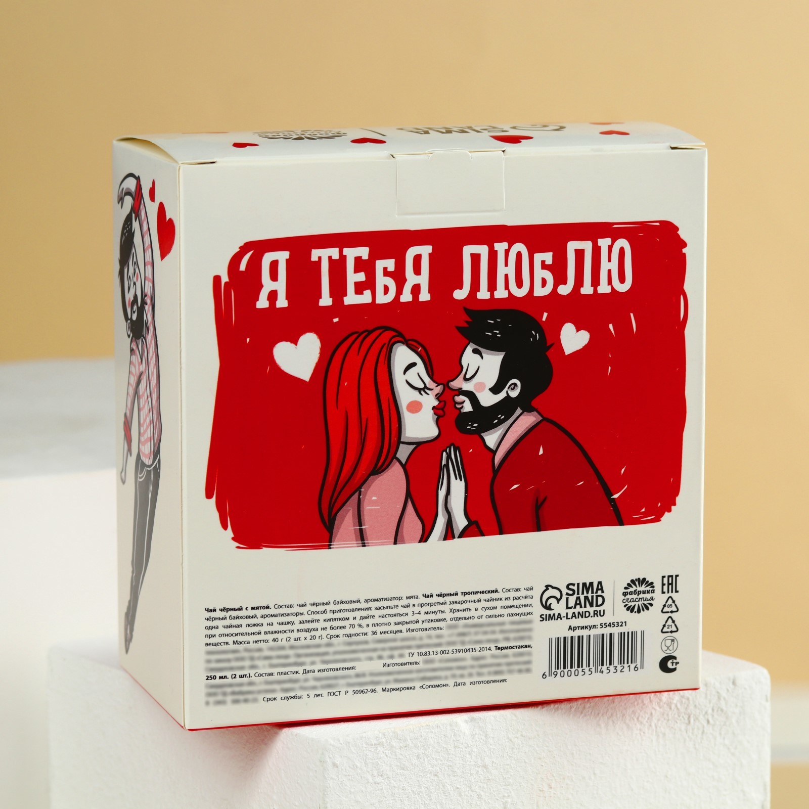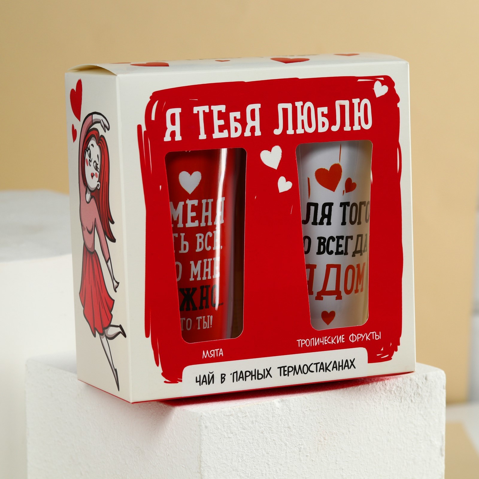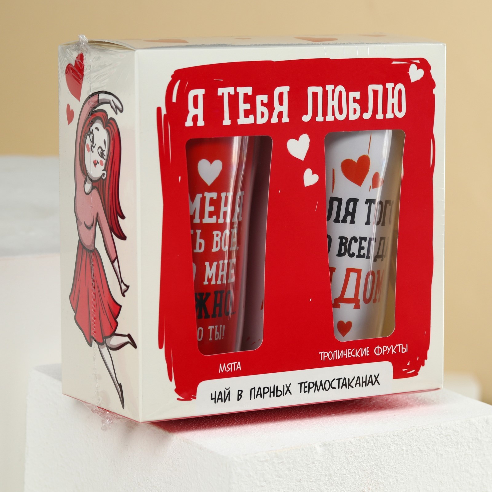 Подарочный набор «Люблю», чёрный чай, мята 20 г., тропические фрукты 20 г., термостаканы 2 шт. х 250 мл.