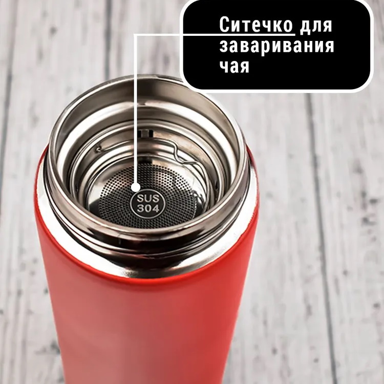Термос за счет своей компактности легко умещается в сумку или рюкзак. Благодаря встроенному на крышке индикатору температуры с LED экраном вы всегда будете знать температуру напитка. Металлический термос не только держит температуру горячим напиткам, но и сохраняет холодным. Главное полезное свойство, отличающее данную модель от многих других – этот термос с ситечком. Подойдет термос для заваривания или процеживания любых напитков.