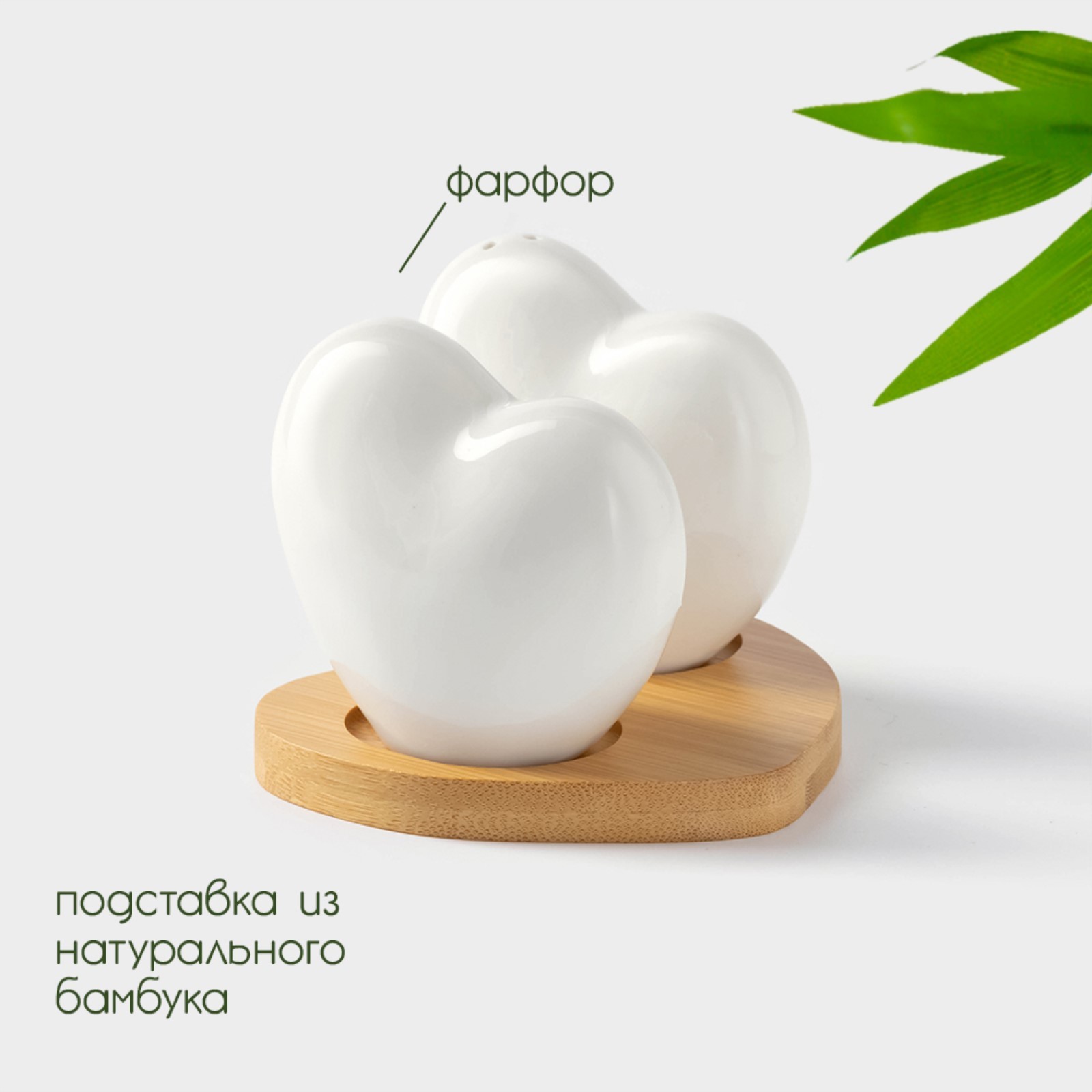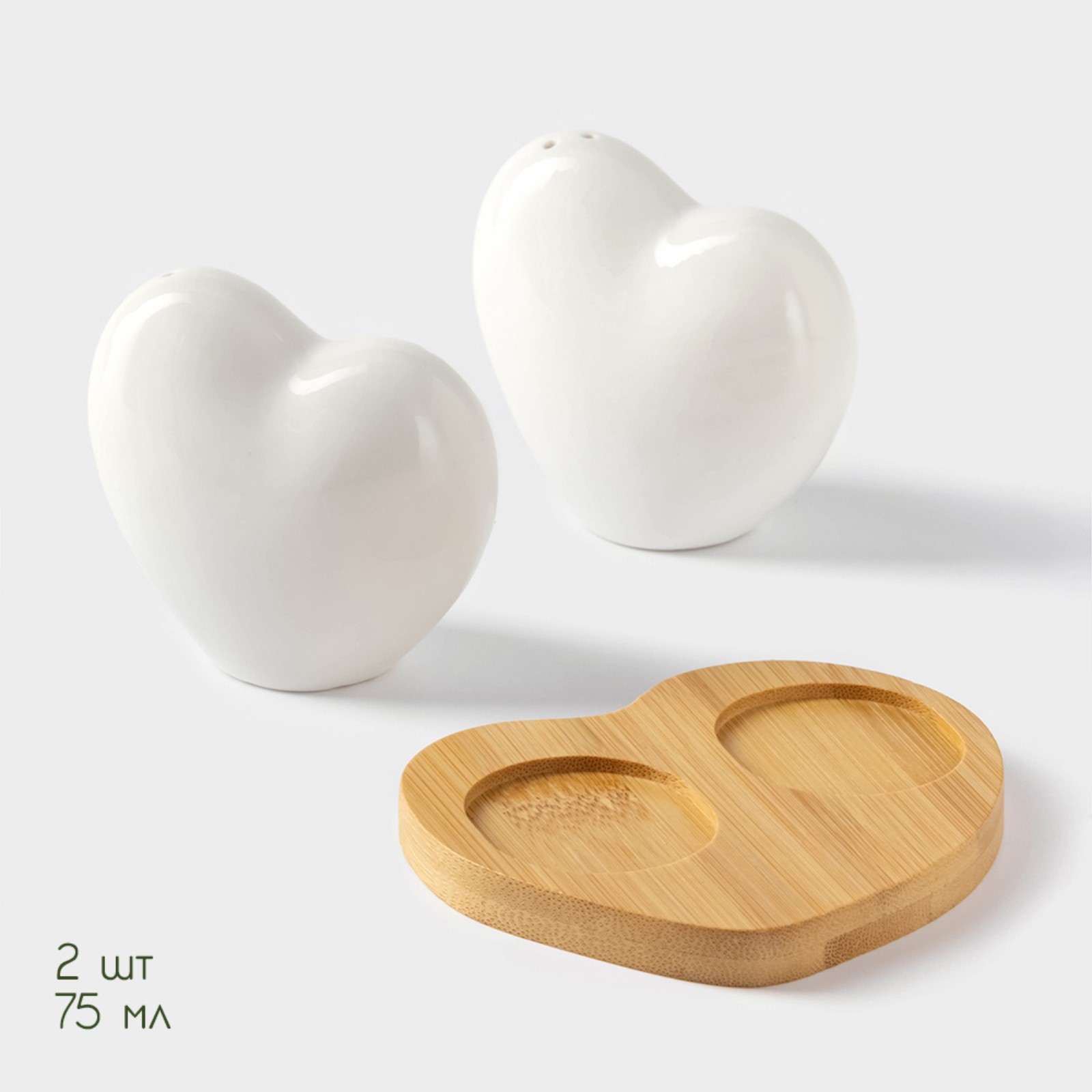 Набор фарфоровый для специй на бамбуковой подставке «Тепло сердец», 2 предмета: солонка 75 мл, перечница 75 мл, цвет белый