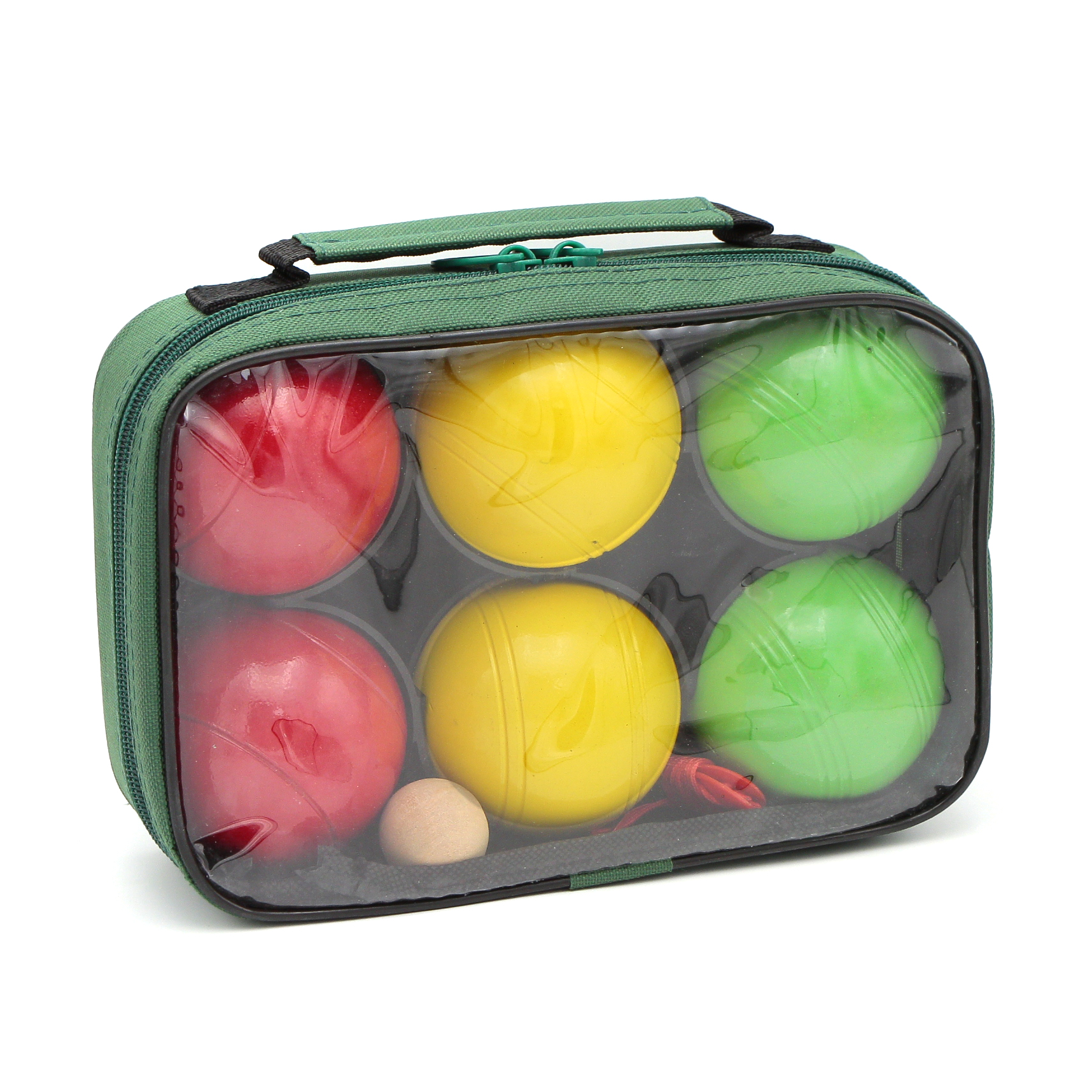 6 шаров (2 красного цвета, 2 зелёного, 2 желтого) в зелёной нейлоновой сумке.