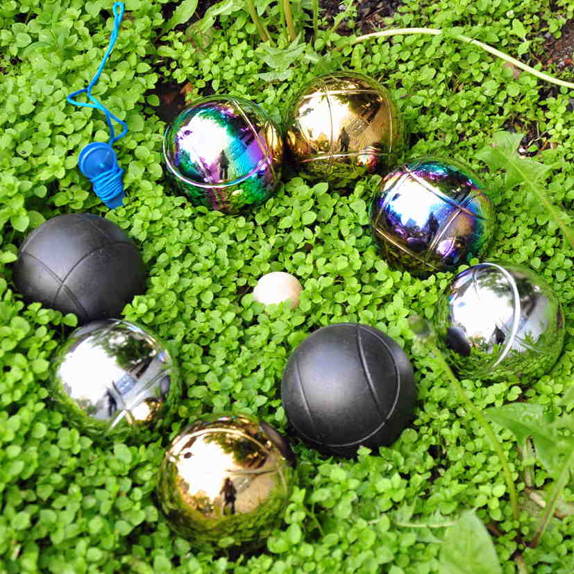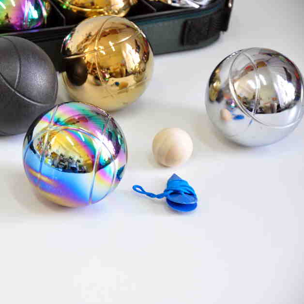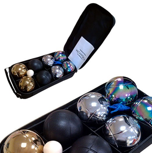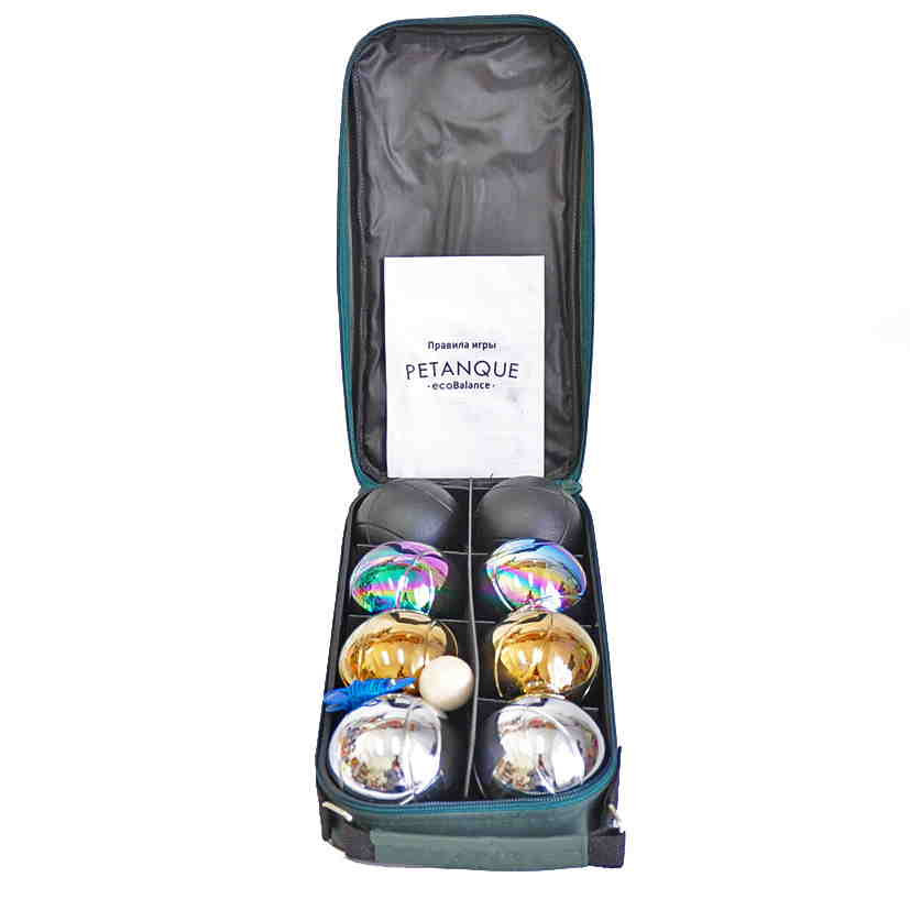 В набор входит 8 шаров для игры в петанк. Такого набора достаточно, чтобы играть в командах по два или три человека. В одном наборе шары отличаются между собой количеством засечек на них. По их количеству игроки определяют свои шары во время игры.