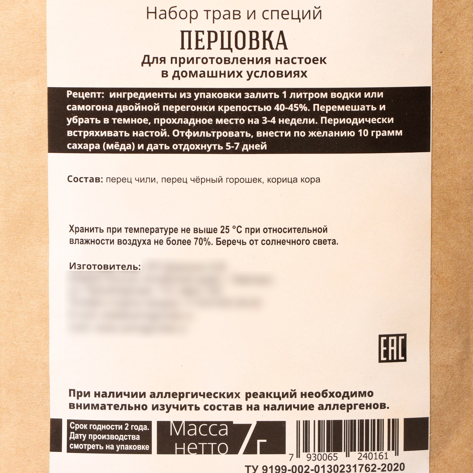Залейте содержимое пакета 1,5 литрами водки, спирта или самогона двойной перегонки с крепостью 40%. Дайте настояться в тёмном месте в течение 10 дней, ежедневно встряхивая. После настаивания отфильтруйте. Добавьте столовую ложку сахара (15–20 г) и тщательно перемешайте до полного растворения. Поставьте в тёмное место на 3 дня для настаивания. Затем разбавьте 40%-й основой до 3 литров; для более насыщенного вкуса можно разбавить в меньшем объёме. Дайте настояться ещё 2 дня в тёмном месте после разбавления.Условия хранения: