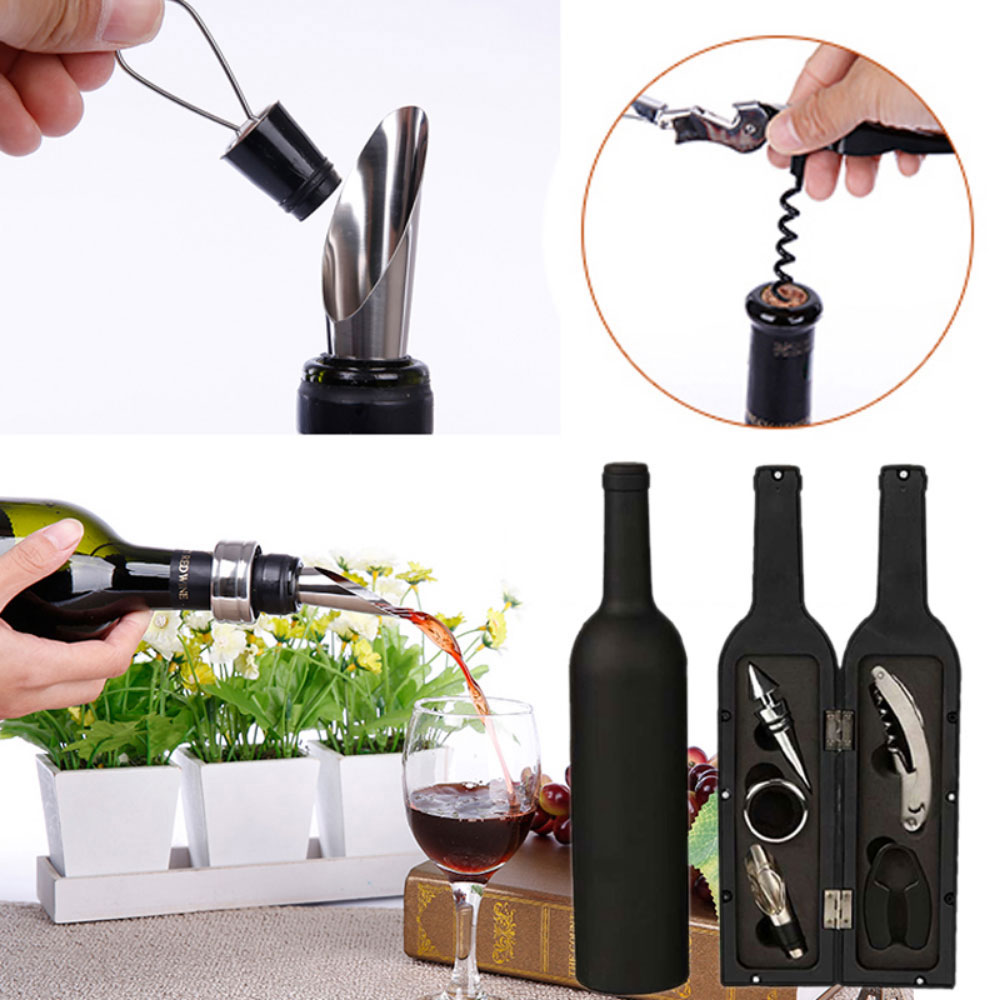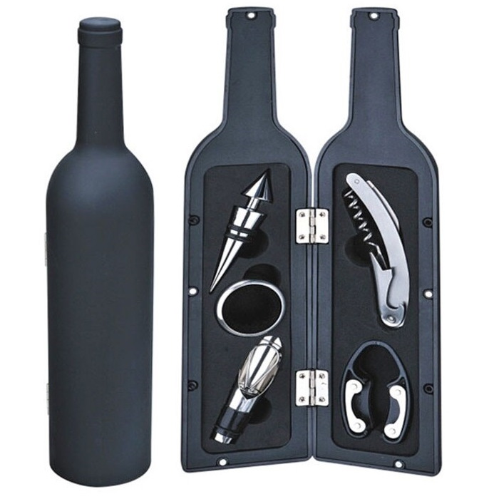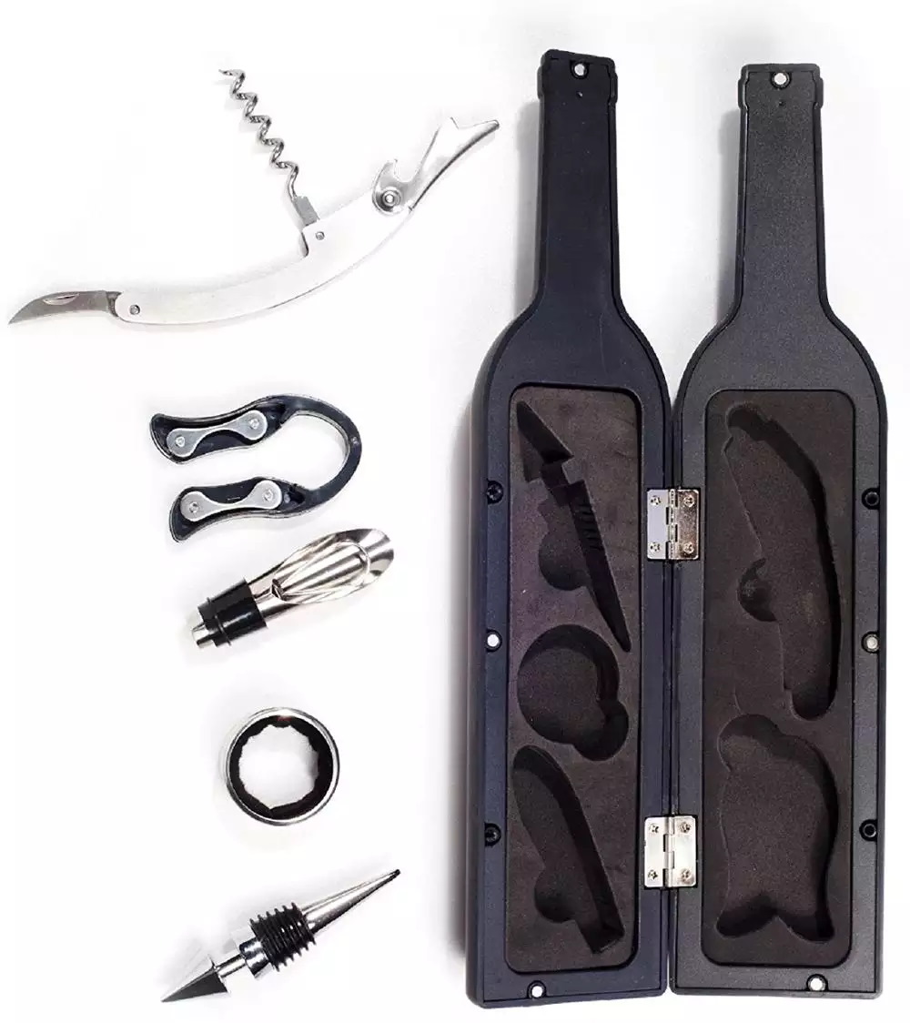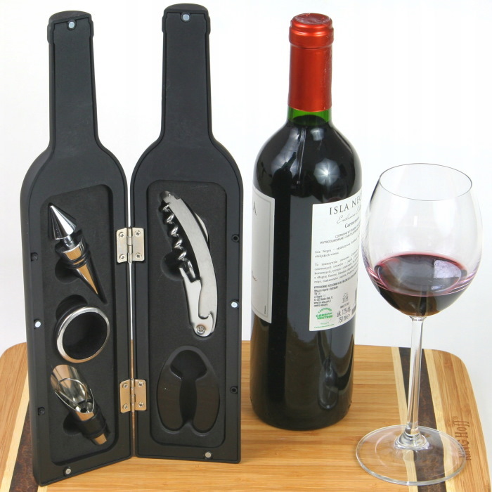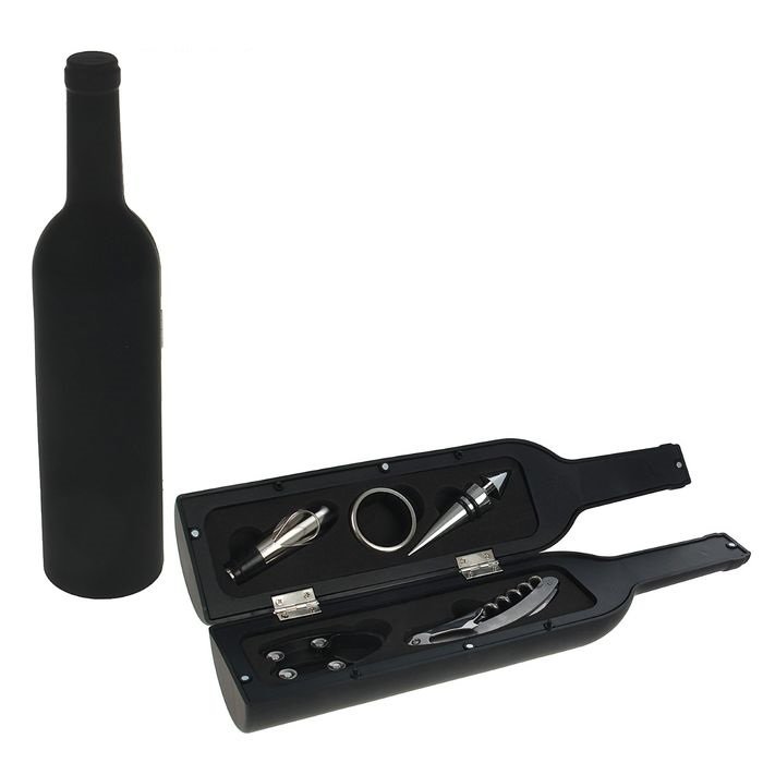В комплекте: высококачественный футляр в виде большой бутылки итальянского вина, универсальный нож-штопор-открывалка, кольцо для сбора капель и специальная пробка, специальный нож для срезания защитной плёнки с бутылки вина, конусная спец-пробка.