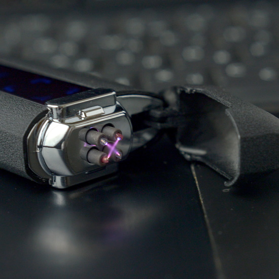 Электроимпульсная USB-зажигалка, работает по принципу миниатюрной молнии, между четырьмя контактами возникает мощный разряд электроимпульсов, которые поджигают любые предметы попавшие в поле разряда. Зажигалка имеет USB выход и заряжается от компьютера либо зарядного устройства.