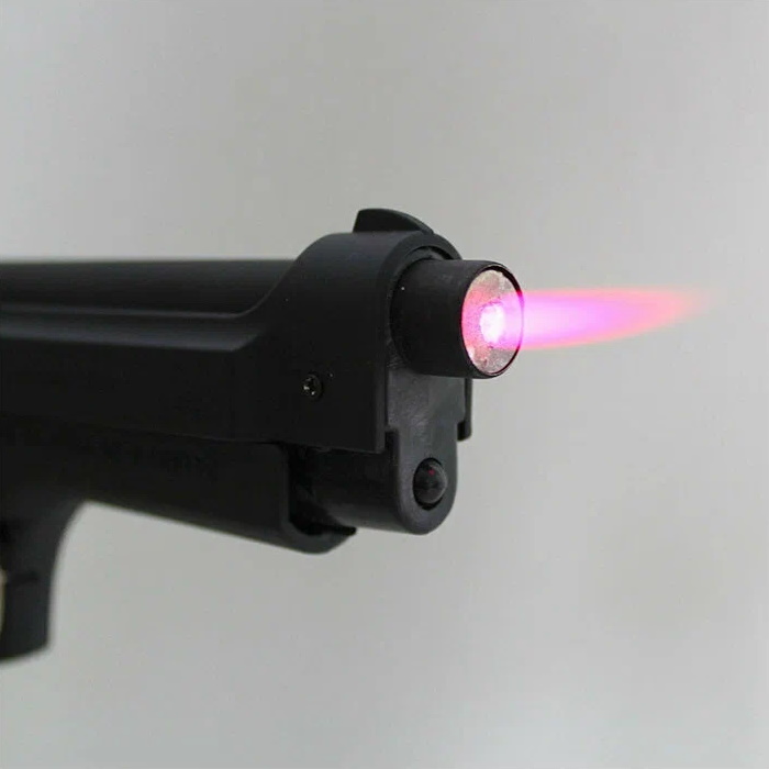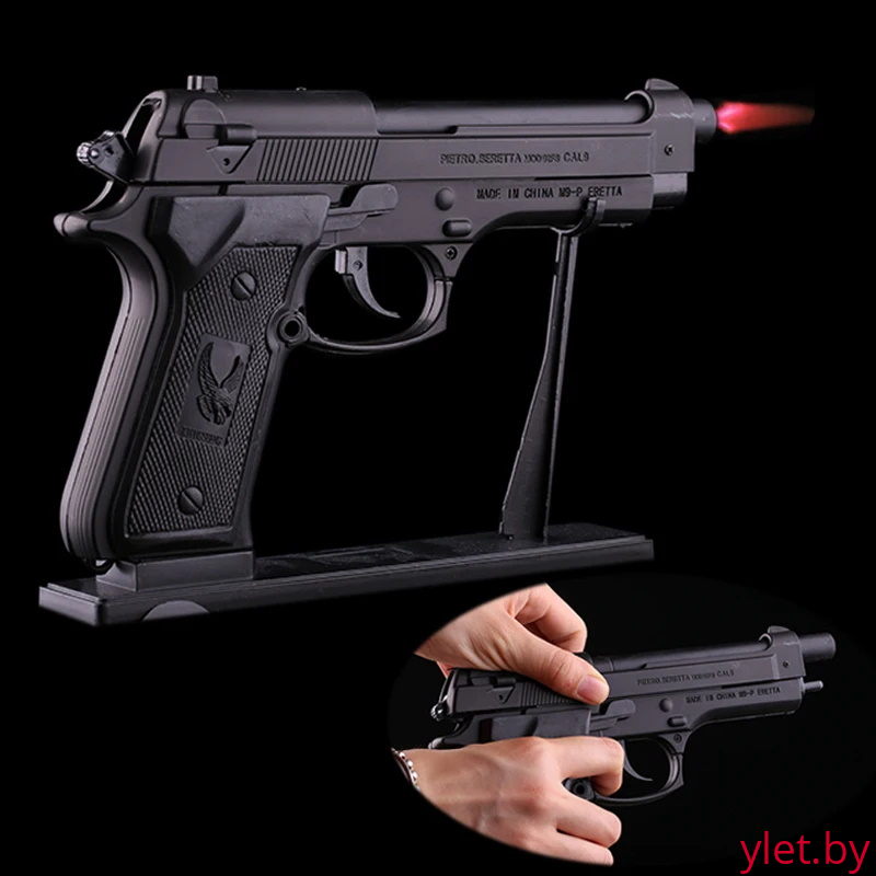 Внешне, почти не отличимый от настоящего, пистолет, на самом деле является зажигалкой. Купить пистолет зажигалку, значит приобрести оригинальный и не дорогой сувенир, который идеально подходит не только курящему человеку. Надежный пьезо механизм прослужит вам долгое время. Турбина, с помощью которой газ подается под давлением, не даст погаснуть пламени даже на сильном ветру. Ну и конечно сам внешней вид, та реалистичность с которой выполнен пистолет-зажигалка приятно удивит не только любителя экзотики.