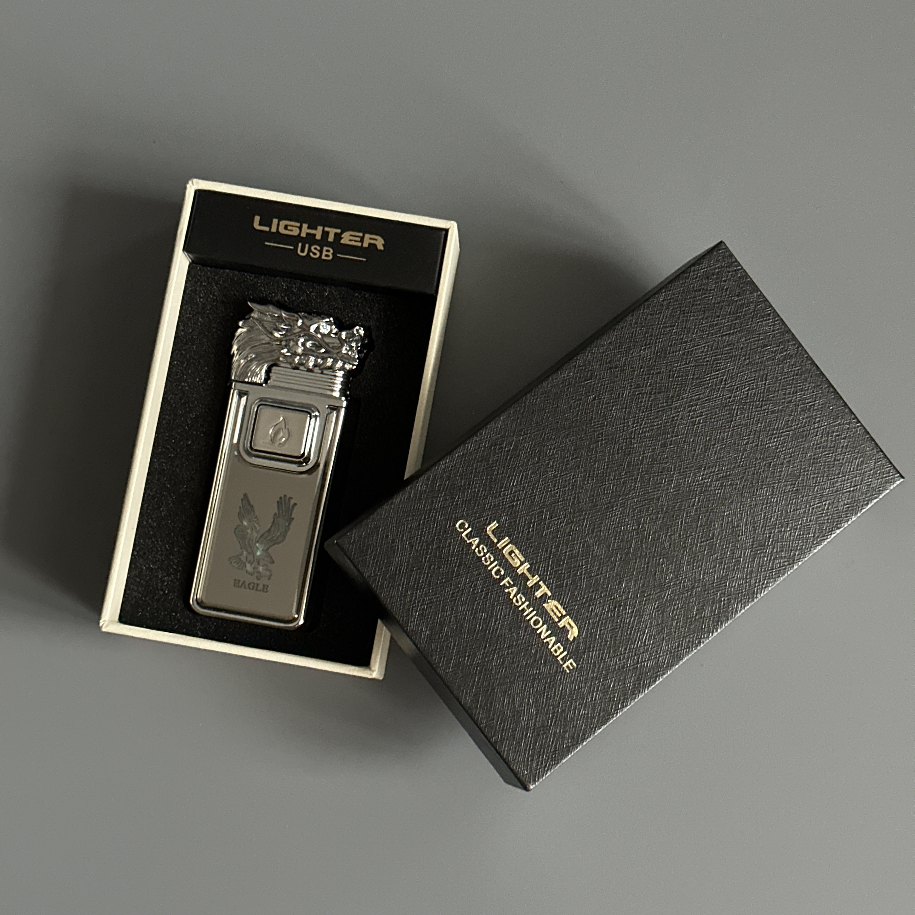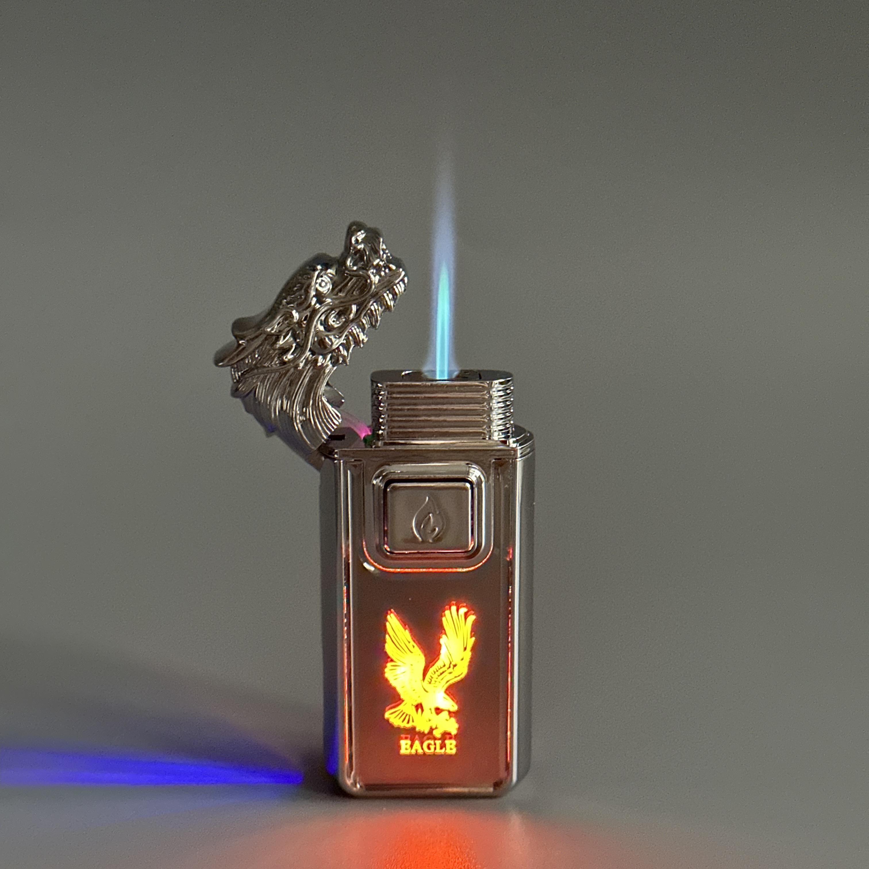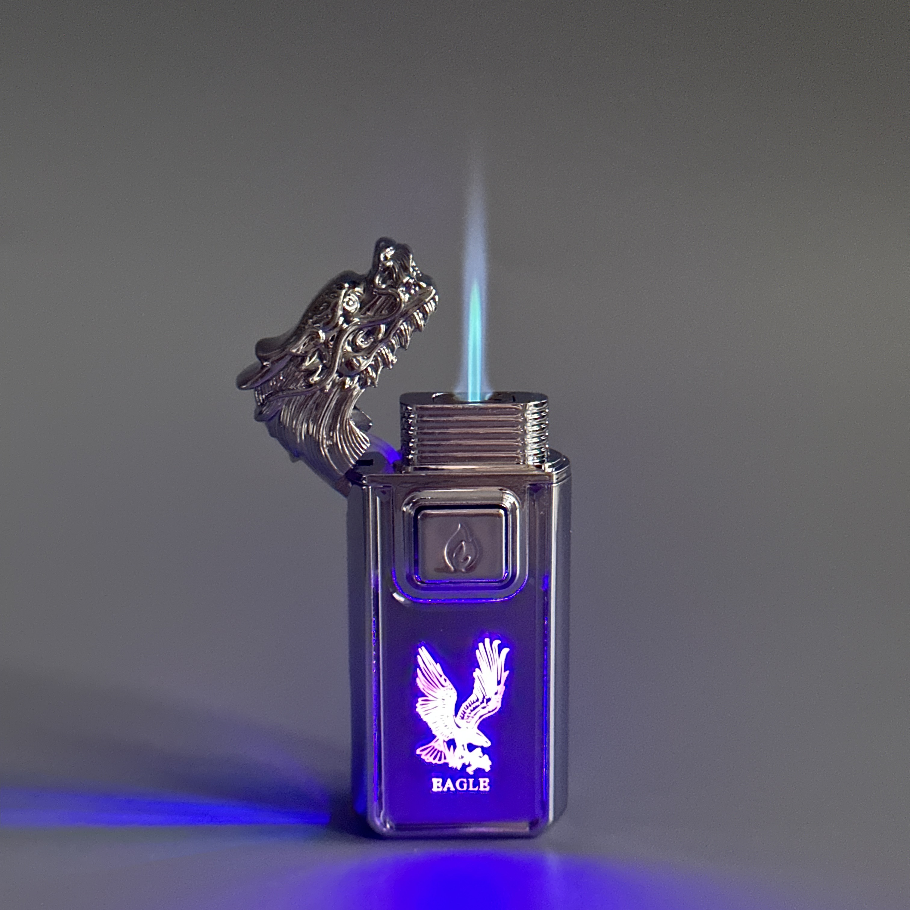 Зажигалка турбо газовая+обычное пламя Голова дракона, серебро, эмблема орла